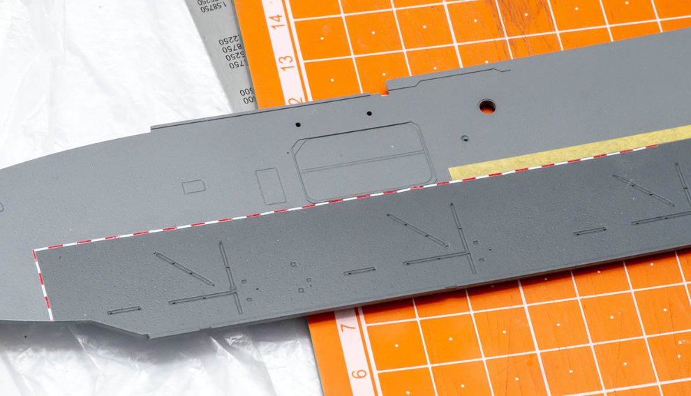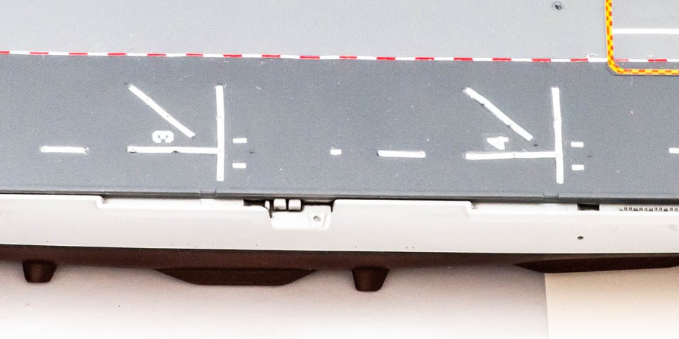 갑판 도색은 2톤, 혹은 3톤 회색으로 해주세요. 2톤은 위 사진처럼 랜딩존과 수납존으로 나눠서 하면 됩니다. (제 경우 선미쪽 엘리베이터 (데칼 6번에 해당) 의 ~로 꺾인 부분 잘못되었으니 따라하면 안됩니다!) 3톤 도색은 엘리베이터를 양쪽의 중간 회색으로 설정하면 됩니다.