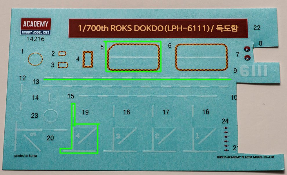 저는 독도함 최신 사진에 맞춰 자작 데칼 (써니스코파 물전사지 - 바탕 흰색) 을 만들어 썼습니다.