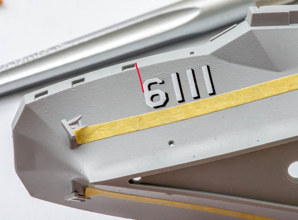 선체 옆의 번호를 붙일 때에도 마스킹테이프로 기준선을 잡아주고, 데칼지의 숫자 밑을 올곧게 직선으로 잘라서 기준선에 착 붙도록 준비합니다. 제 기준선은 선수의 닻의 아래쪽 뾰족한 팁입니다.