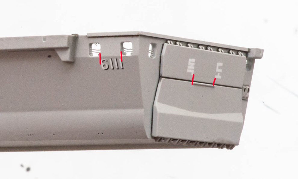 아카데미 데칼이 1/600 정도로 좀 크게 나와서 현실과 잘 안 맞습니다. 그래도 숫자 앞을 위와 같이 상단의 구멍과 맞추면 얼추 맞습니다.