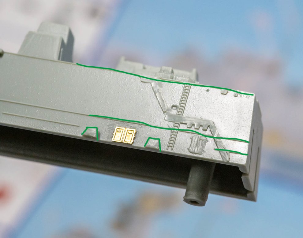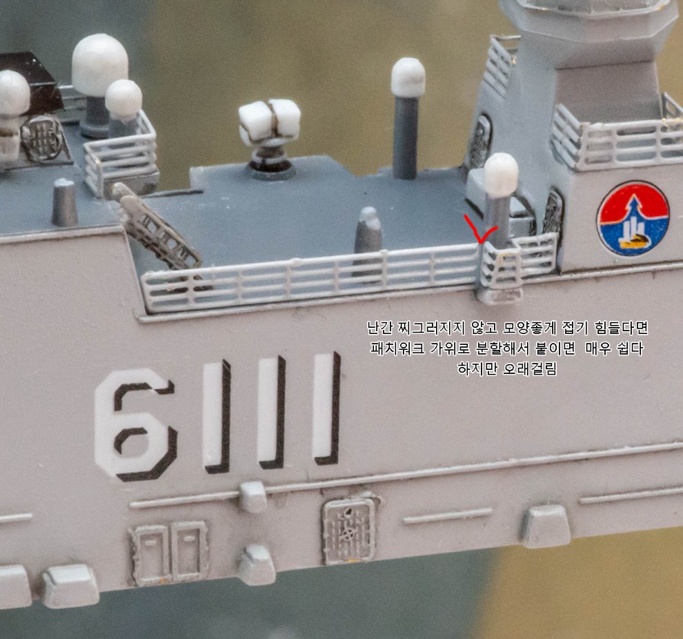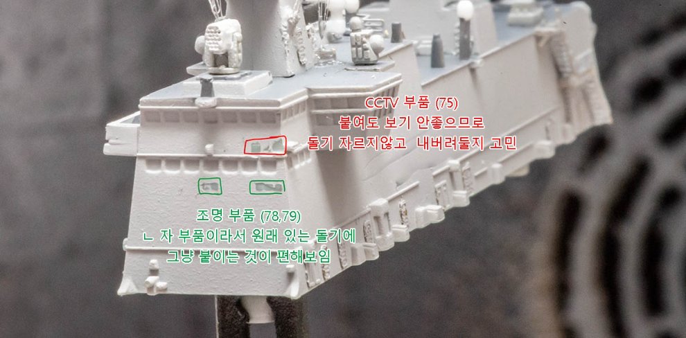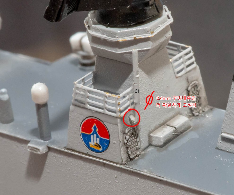 * 위 사진에서 빨간색 두군데 기둥은 포토에칭 난간과 간섭을 일으킵니다. 아마도 서치라이트 기둥인 것 같은데, 잘라도 무방하리라 봅니다.