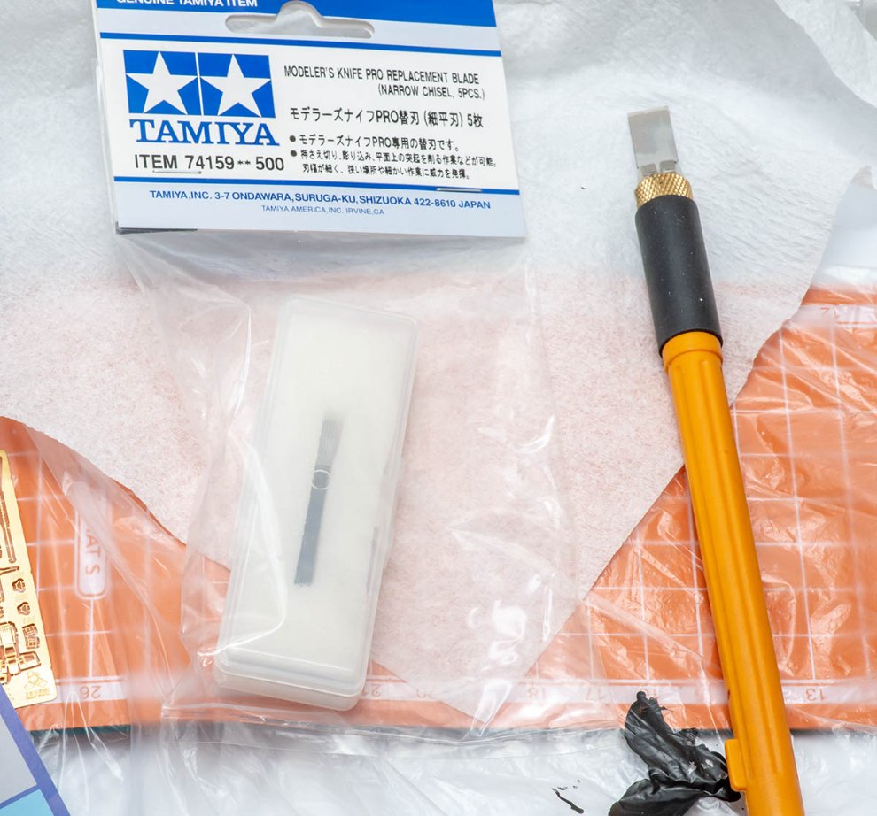 타미야 74159 평날 5mm 짜리입니다. 올파 AK-4 아트나이프를 구입하면 따라오는 10mm 평날의 5mm 버전으로, 올파에서 만든 OEM 칼날이기도 합니다. 크게 비싸지 않고 하비샵에 가면 판매하니, 이걸로 좁은 곳의 게이트나 제거할 부품을 밀어내듯이 잘라내세요.