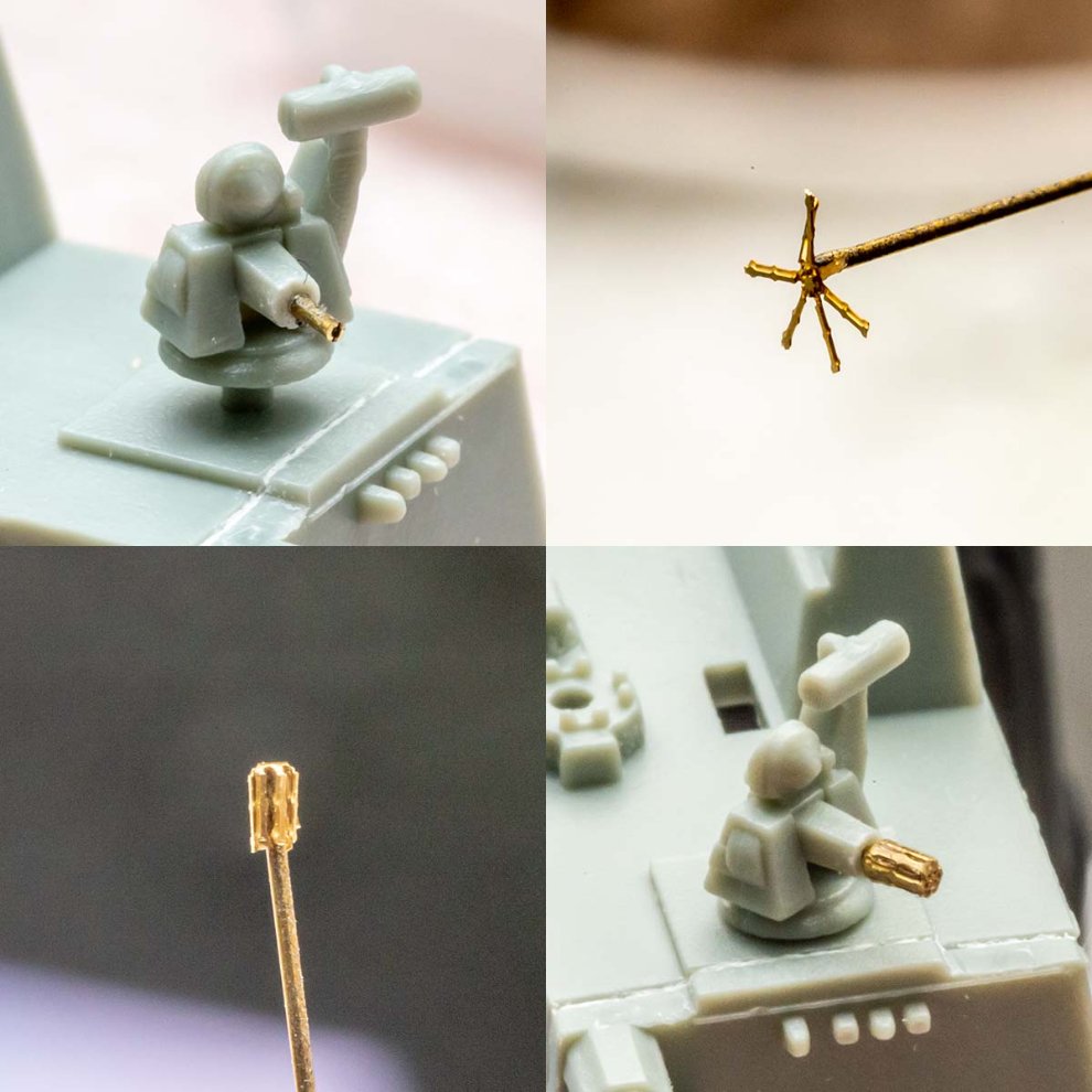 골키퍼 대공포 포신은 여러가지 만드는 방법이 있겠지만 제가 쓴 방법은 0.40mm 황동봉을 중앙에 순접으로 붙인 후, 바닥에 꽉 누른 상태에서 아트나이프로 꽃잎을 하나하나 올려세우기 였습니다.