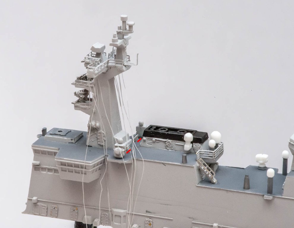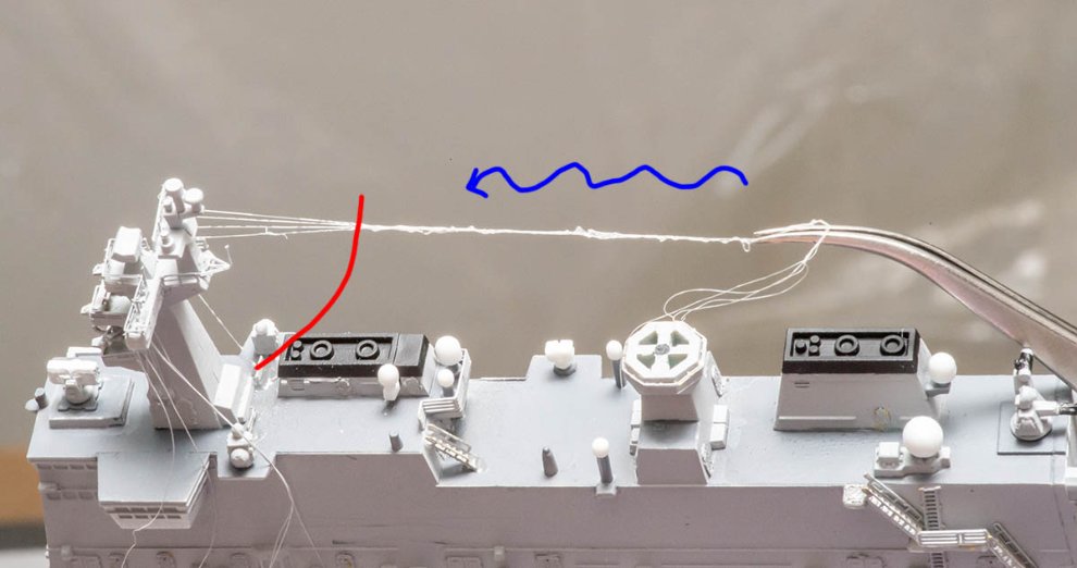 함교의 안테나탑에 걸리는 안테나 줄은 수려함을 위해 위와 같이 발산과 수렴시키도록 했습니다. 안테나 줄은 국산인 인피니 모델의 라이크라 리깅실 - 20 데니어 - 화이트 색상을 이용했습니다.
