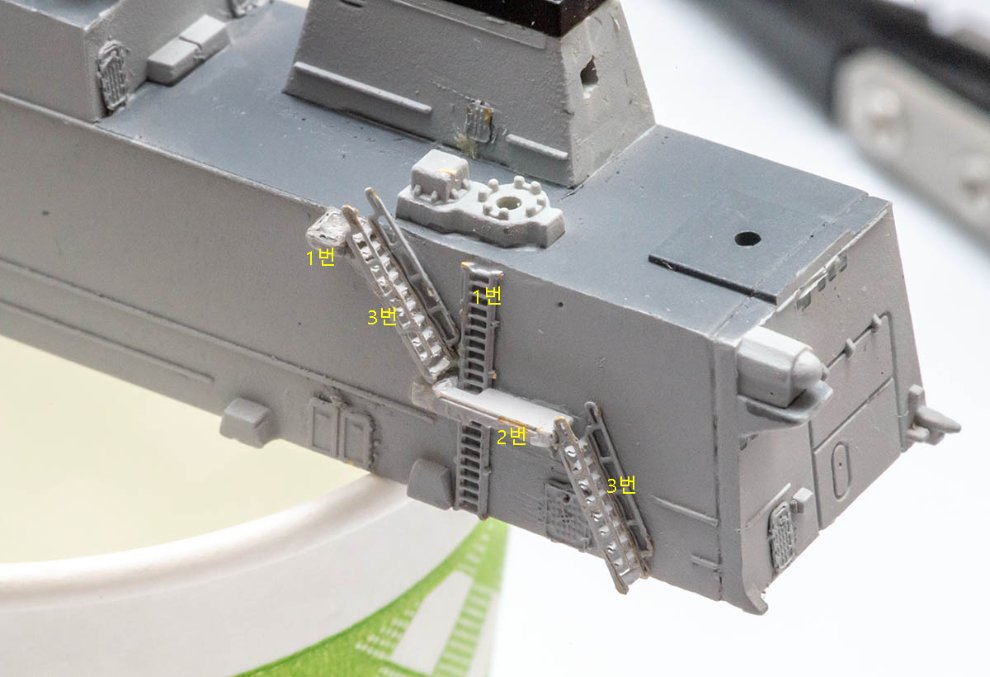 재미있는 부분인 함교 계단은 위의 난간을 기준으로 작업해야 합니다. 따라서 1번부터 순서대로 붙여야 하죠.
