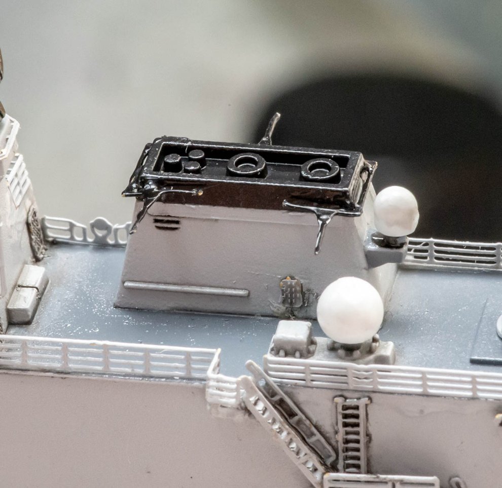 함교까지 전부 끝냈으면 유광 마감재 Varnish (아마도 락카)로 전부 칠해준 후, 패널라이너 (에나멜을 희석한 워싱액) 등으로 먹선을 먹여줍니다. 하루 지나서 굳으면 에나멜 신너를 묻힌 면봉 수천개로 닦아내면서 먹선 작업을 마무리합니다.