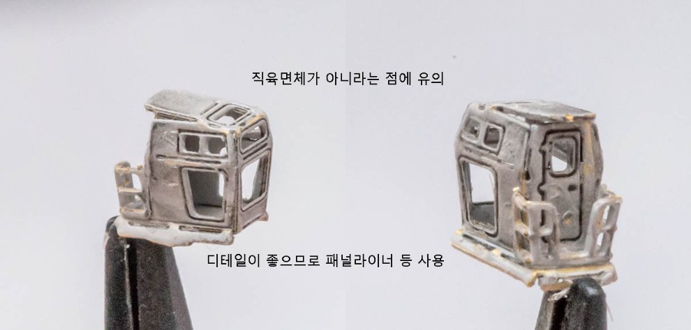아래 크레인 쪽은 원래 플라스틱으로 상당히 두껍게 덮혀있는데, 워낙 작아서 아트나이프로 도려내는 작업하다가 손 다치기 쉽습니다. 저는 전동 드릴로 긁어내듯 작업했습니다.
