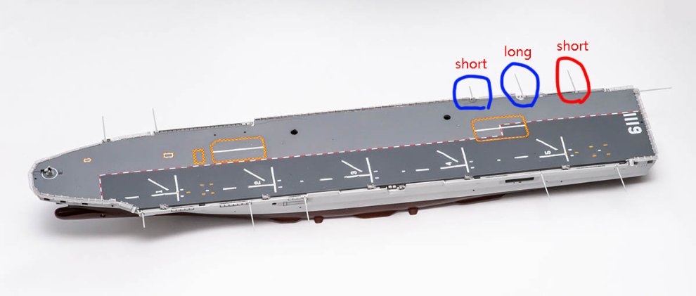 안테나도 세군데 위치의 길이가 현실과 다릅니다. 시간이 지나면서 바뀐 건지는 모르겠지만 최신 독도함에 맞추고자 한다면 설명서와 다르게 붙여줍니다. 빨간색은 여분의 부품이 없지만 긴걸 잘라내주면 됩니다.
