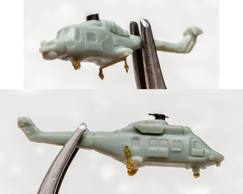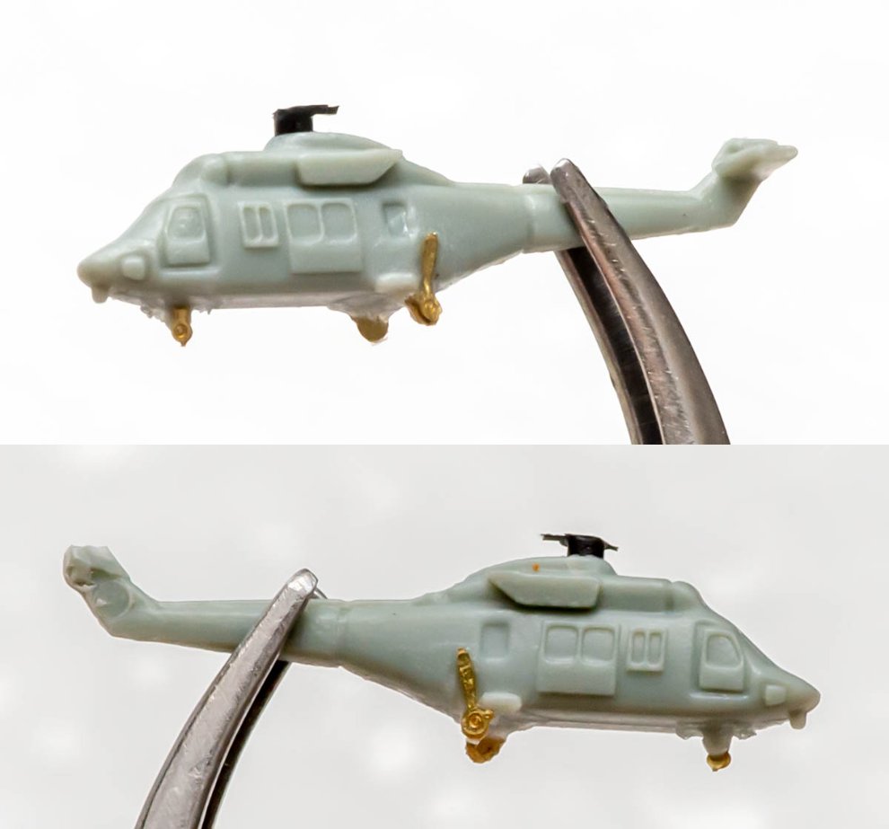 위 사진과 같이 뒷바퀴나 테일로터 등을 도려내야 합니다. 앞바퀴 PE 부품은 너무 작아서 그냥 기존 플라스틱에 반쪽짜리 PE 부품을 덧붙이는 편이 더 간편하고 빠릅니다.