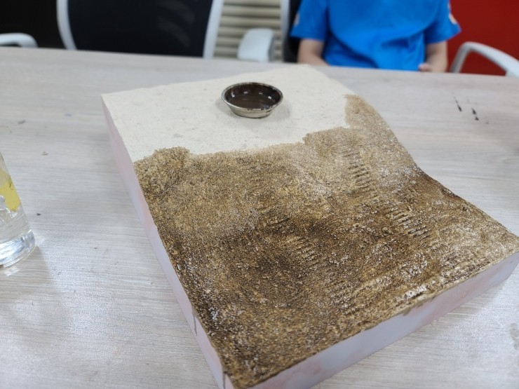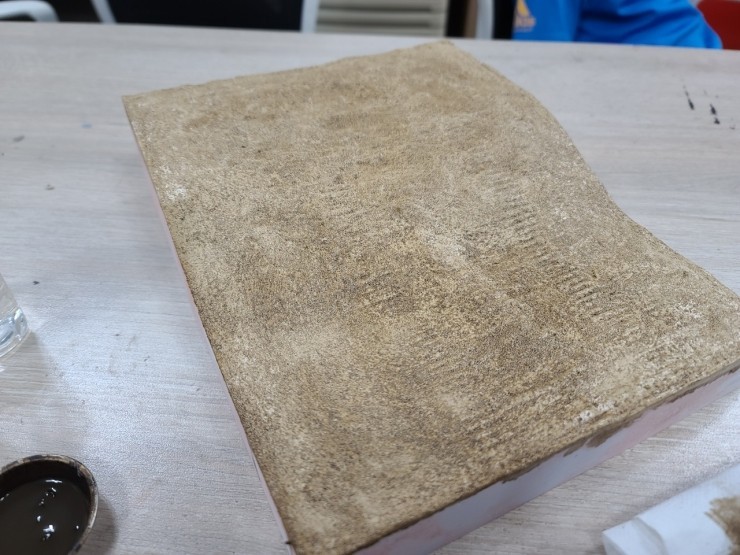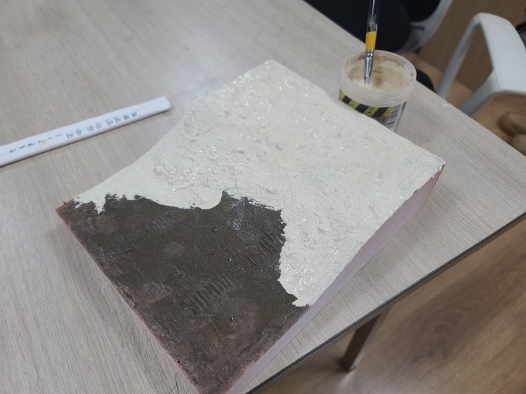 다시 건조한 느낌 흙 재료로 다시 한번 발라줍니다 건조한 흙 재료라 그런지 작은 모래 알갱이들이 들어 있습니다