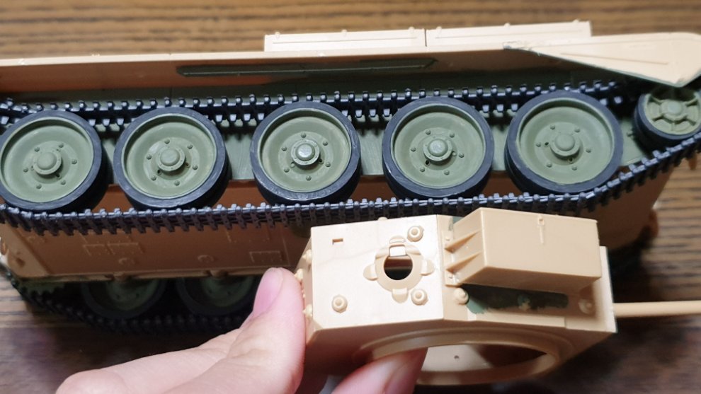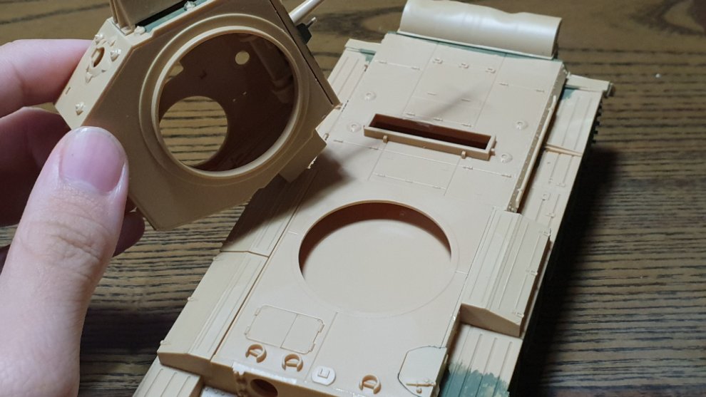 먼저 포탑링... 우리가 아는 그 방식이 아니길레 아스카 제품들 같은 그런 방식인가 했더니 그것도 아니였고 포탑의 포탑링 숫놈에 앞뒤로 돌기가 있습니다. 그 작은 돌기 덕분에 뻑뻑하게 끼워져서 잘 빠지진 않았는데 문제는 정방향으로 포탑을 돌리고 싶은데 잘 안되더라구요. 그래서 그냥 갈아내버렸습니다... 그냥 평범한 일반 방식을 써줬으면 좋았을텐데 하는 생각도 들고, 조종수와 무전수 해치를 열어주고 싶었는데 조종수 해치는 조종수를 태워서 가릴 수 있었지만 무전수 해치의 경우 내부의 밝은 모래색 때문인지 정작 열어두고 보니 내부도 훤히 보이고 사진상 보이는 포탑링 아래의 평평한 구조물까지 보이다보니 영... 이상하더군요. 그래서 그냥 닫았습니다.