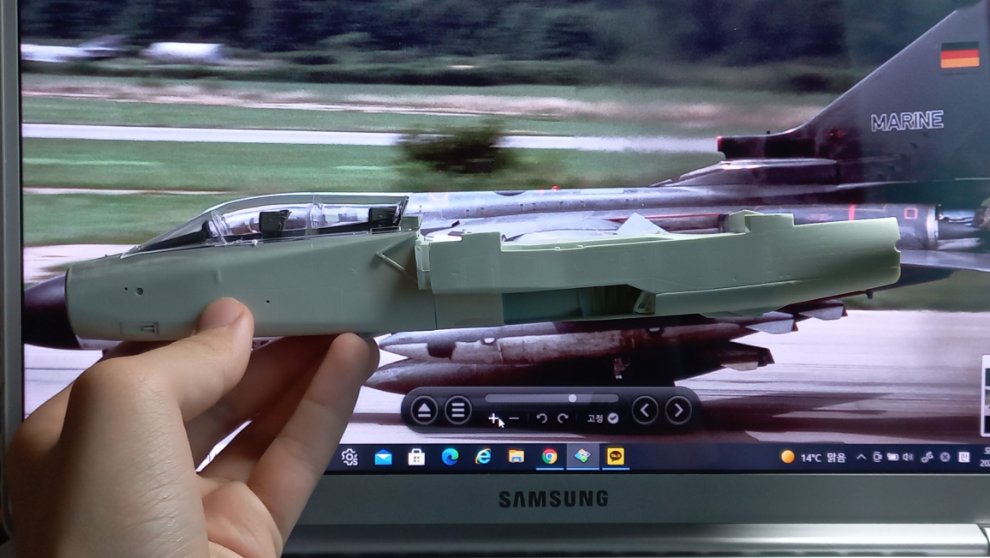 앞서 보여드린 이 두 사진을 자세히 보시면 주익 날개랑 몇가지 부분에 노란색 사각형 띠 같은것이 있습니다. 그리고 수평미익의 각도 표시문(?)은 잘 보이게 해야 되서인지 빨간색이구요. 하필 제가 가진 모든 데칼들을 짜깁기 해도 저 두가지를 비롯해서 수직미익 하단부 MARINE 좌측 하단부의 마름모꼴 문양(유로파이터의 그것 같은)도 없고... 중요한 MARINE 문구와 해군 마크, 비행단 마크와 기타 문구는 구했지만 정작 또 다른 중요한것을 구하지 못했으니 아쉽습니다. 노란띠야 그냥 마스킹을 하면 되지 않을까 싶었는데 자세히 보니 그냥 노란색으로 띠가 둘러진 것은 아니였더군요... 노란색/빨간색으로 지그재그 형식? 동그라미 형식?으로 되어져 있던데... 어제 그거 때문에 급히 밤에 장터에 구매글을 올렸습니다.