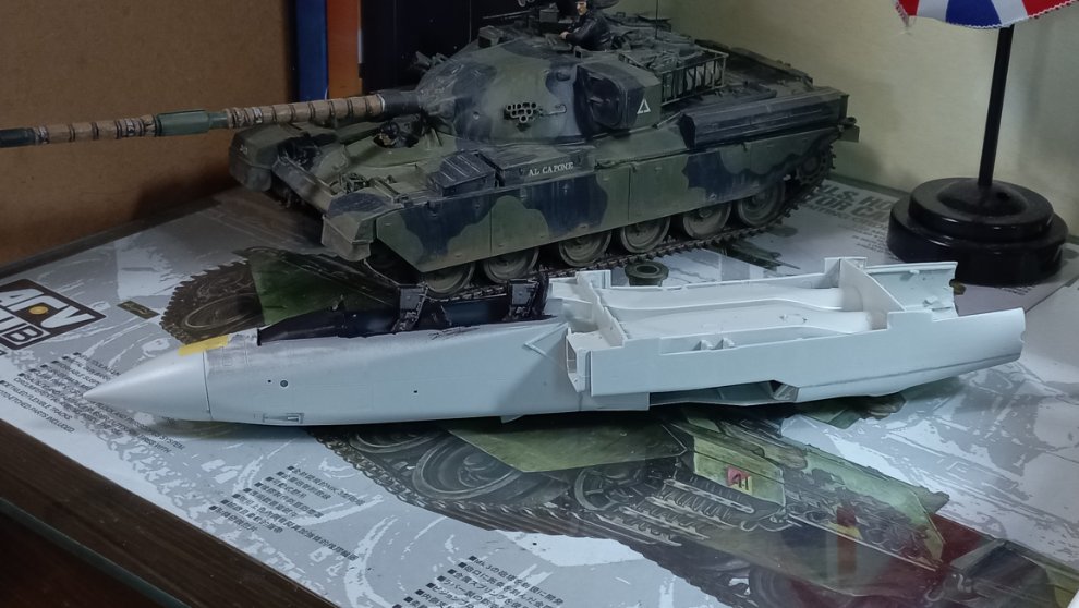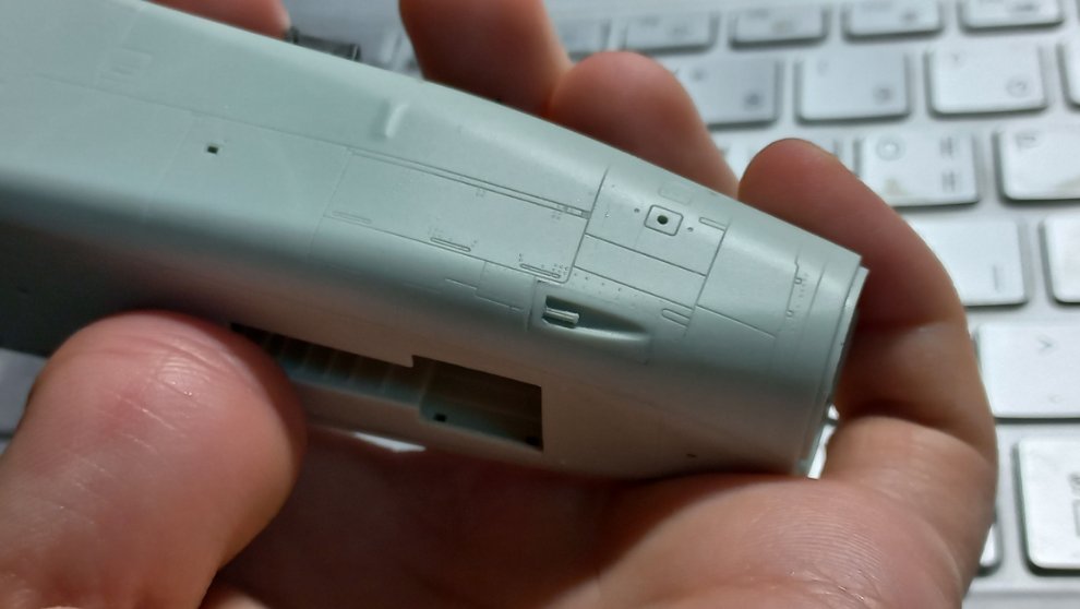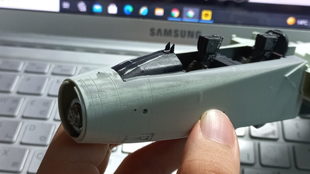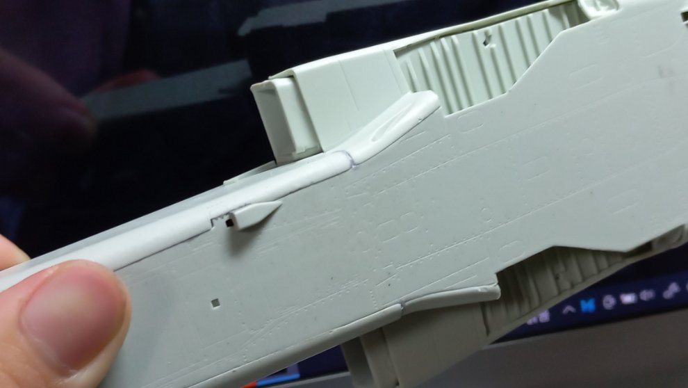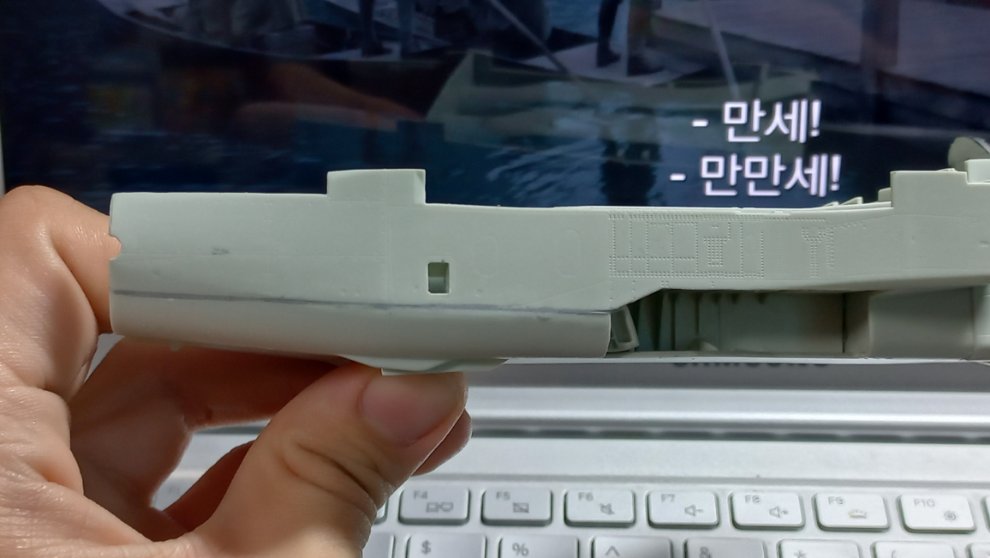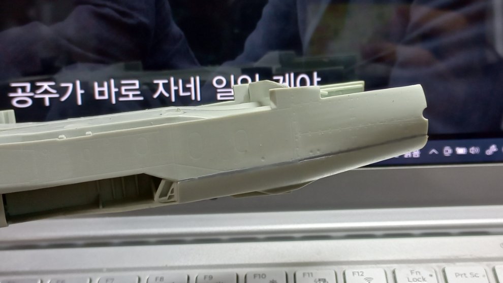 참, 제가 잘못 조립한건지 모르겠는데 에어 인테이크 커버 - 랜딩기어 베이 사이에 저런 계단형 단차가 발생하더라구요. 해결해 보려고 했는데 제 실력으론 무리였습니다... 그리고 여기저기 단차가 조금 크게 보여서 퍼티 작업을 해주고 저녁 식사(라면)을 마치고 다시 손을 보았습니다.