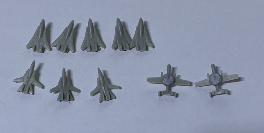 함재기는 날개를 접은 톰캣 5대, 날개를 편 톰캣 3대, 조기경보기 2대가 들어 있습니다. 조기경보기는 가운데에 수축이 있어서 퍼티를 바른 상태입니다.