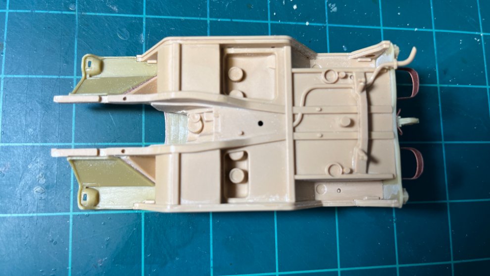 중간중간 보이는 밀핀자국들은 서페이서를 올리기 전에 전체적으로 퍼티를 써서 수정해줄 예정입니다. 조수석 자리의 저 큰 구멍은 단순히 퍼티만 가지고 메꿀 수 있을 것 같지는 않아서 지름이 맞는 프라봉을 일단 끼워넣고 표면에만 퍼티를 써서 깨끗하게 메워줄 예정입니다. 도장시 떼어서 해야 할 곳도 있어서 필요한 곳에는 무수지접착제를 써서 결합을 해놓았습니다.
