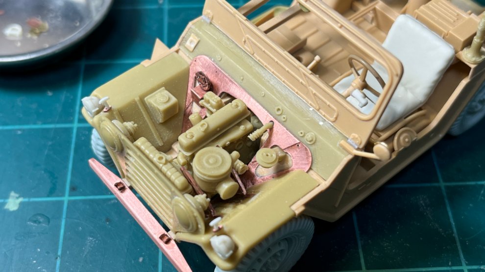 사진에서 보면 엔진 좌측의 우측휀더에 붙어있는 네모난 통은 워셔액통이라고 합니다 ㅎㅎㅎ 막상 Verlinden 업데이트세트의 설명서대로(설명서는 정말 불친절하게 도면 두어개가 들어있고 알아서 만들어야 합니다 ㅎㅎ) 엔진룸을 만들어놓고 보니 훈련장면의 디오라마에 엔진룸을 열고 있어야 좀 뜬금없는 부분이 되겠더군요. 그래서 대단한 정비는 아니고 디오라마에서는 탄박스 등 보급품들을 싣고있을 때 이 MUTT에는 워셔액이나 좀 보충하려고 엔진후드를 열어보는 정도로 연출해주려고 합니다.