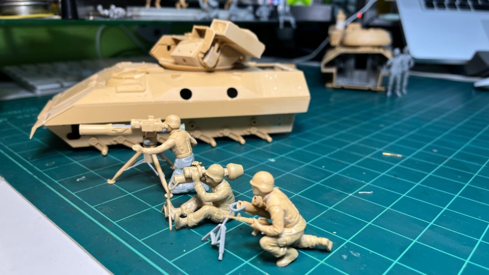 어릴때 아카데미과학의 카피품으로 이 제품을 만들었을 때엔 런너에 저 Tripod를 잘 세워주기 위한 지그가 새겨져 있는 것이 참 대단한 아이디어라고 생각했습니다. 키트는 1983년에 발매되었지만 1991년에 발매된 Dragon의 U.S. Marine Tank-Killers에 들어있는 TOW Missile Launcher보다 훨씬 더 정밀해서 Tank-Killers를 구입해놓고도 결국 다시 Tamiya 제품으로 만들어주었습니다. Tamiya 키트에 재현되어있지 않은 거치대의 미세조절레버 두개와 Tripod의 지지대정도만 Dragon 제품에서 따서 붙여주었고, 디오라마에서는 TOW를 발사하는 장면을 만들어줘야 하기 때문에 Launcher의 내부도 얇고 깔끔하게 잘 갈아내어 TOW Missile을 직접 끼울 수 있도록 해주었습니다. TOW 특유의 해바라기같은(?) 특유의 끝단부품은 MENG의 M3A3 인테리어세트에 들어있는 것을 사용하였습니다.