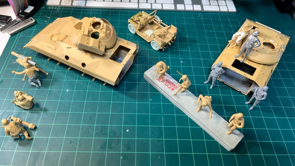 구상하고 있는 디오라마는 대략 이런 레이아웃입니다. 제가 운영하고 있는 [현용AFV모델링클럽]에서 금년도 온라인콘테스트 테마를 [걸프전/80년대미군]으로 정해서 진행중인데, 저는 운영진이라 콘테스트 참가는 불가능해서 찬조작품으로 만들고 있습니다. 요즘 눈높이로는 디테일업을 많이 해줘야 하는 M2A0 Bradley를 두대나 넣는 것이기도 하고 요 당시의 복식(Woodland BDU/PASGT헬멧/ALICE장비)을 재현해주고 있는 제품이라봐야 Tamiya의 아메리카현용육군보병세트 한가지가 전부여서 키트의 팔다리를 바꿔가며 다른 포즈를 만들어보려고 노력중입니다. M2A0 Bradley 한대에는 6명의 보병이 탑승하도록 되어 있고 Bradley가 두대여서 12명, MUTT가 두대 등장할 예정이니 적어도 보병/운전병이 14명, 전차병이 한대당 3명씩 6명이 등장해야 해서 인형제작의 스트레스를 엄청 받고 있습니다. 전차병은 Velinden Production의 제품들을 좀 구했고, Dragon의 U.S. Tank Crew도 구해놓긴 했습니다. 디오라마의 내용은 특별한 것 없이 어릴때 모형점이나 디오라마가이드북에서 많이 봤던 쌍팔년도 식의 [브래들리 뒷문에서 뛰어나오는 현대보병]의 컨셉입니다 ㅎㅎㅎ