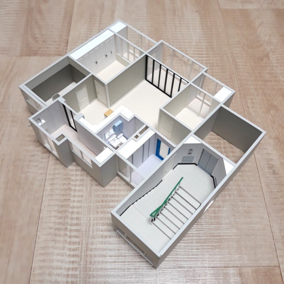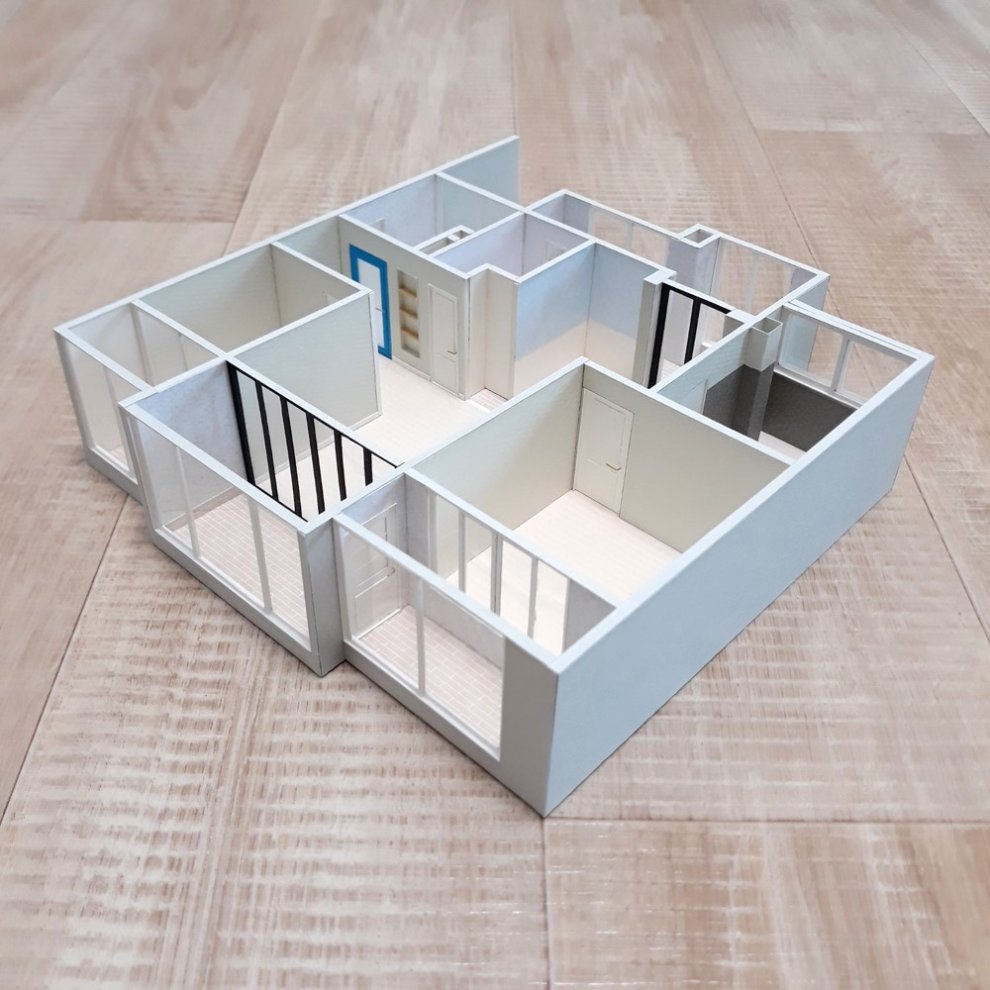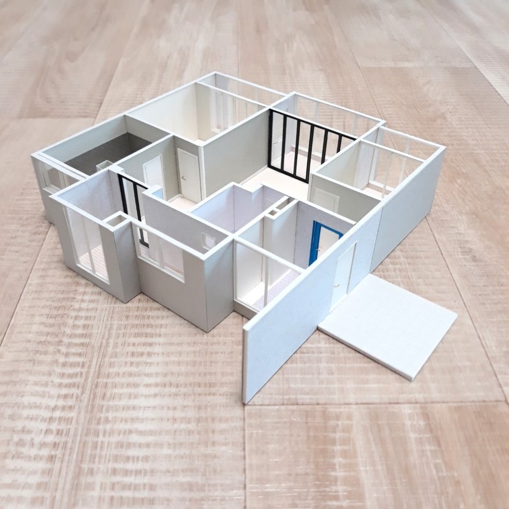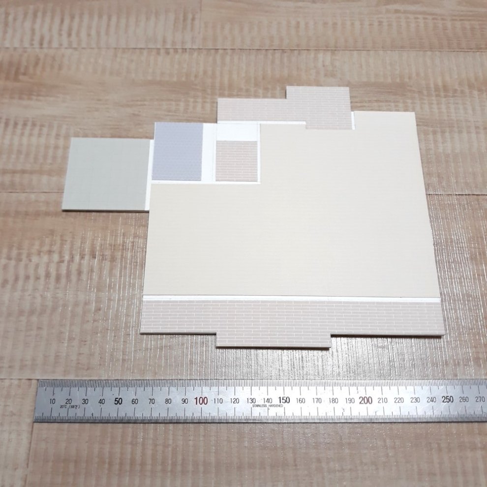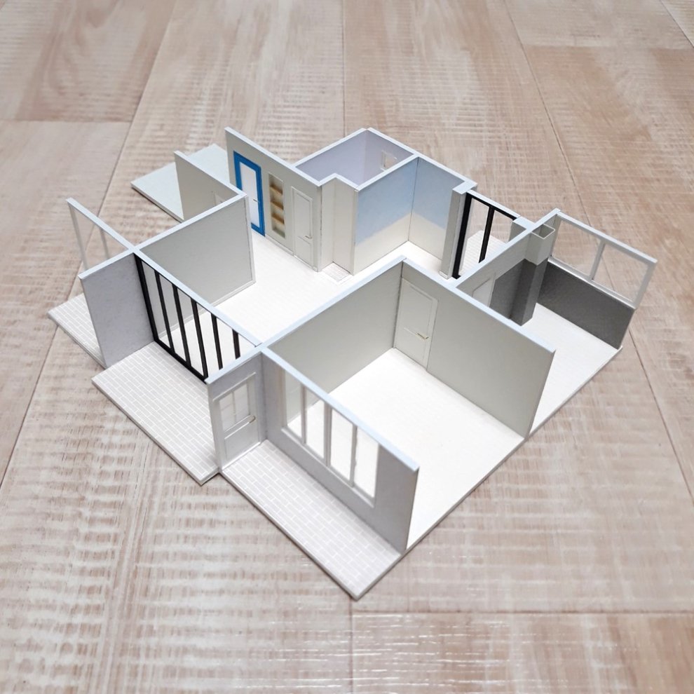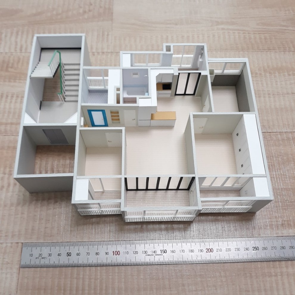 내부의 벽체는 2mm 하드보드를 사용하고 벽지는 주로 0.25mm 머메이드가 어느 정도 두께가 있어 질감이 좋습니다. 창문은 OHP 필름과 데코레이션 테이프를 활용하고, 문 손잡이는 0.5mm 황동선이 적당합니다.