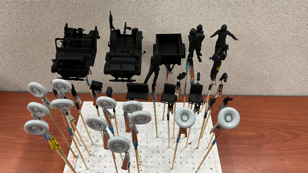 프라스틱+에칭+레진+3D출력물이 섞인 차체에는 Mr. Surfacer Primer 1000을 뿌려준 후, IPP의 슈퍼블랙(무광)을 전체적으로 뿌려주고...
