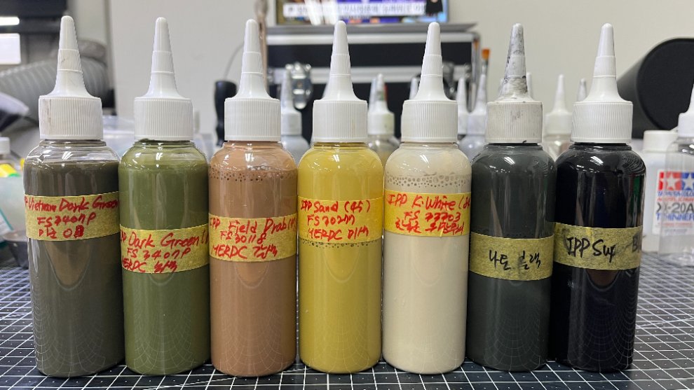 MERDC의 4색위장을 위해 IPP의 사진과 같은 도료들을 준비해주었습니다 (45번 Sand는 사용하지 않았습니다)