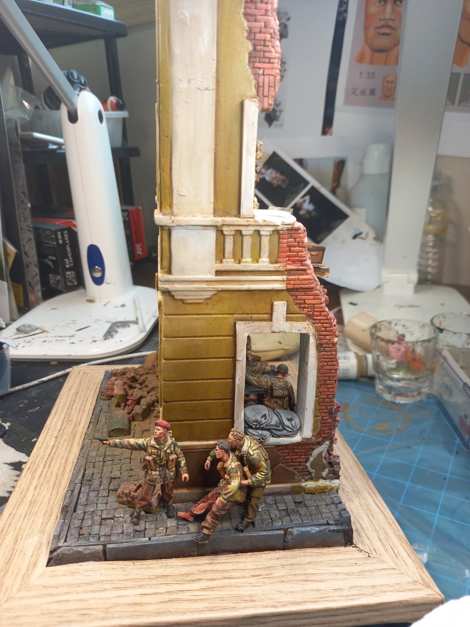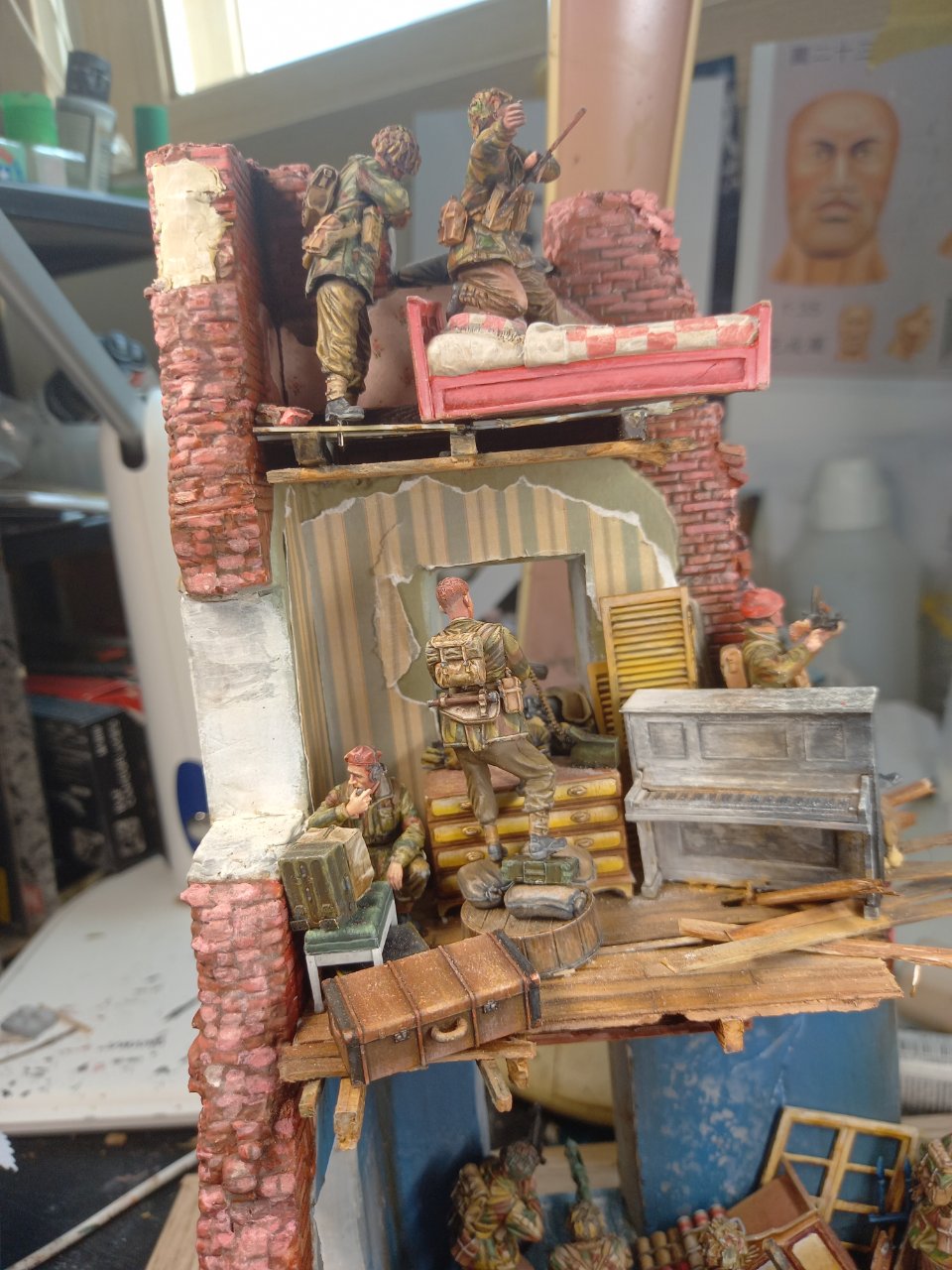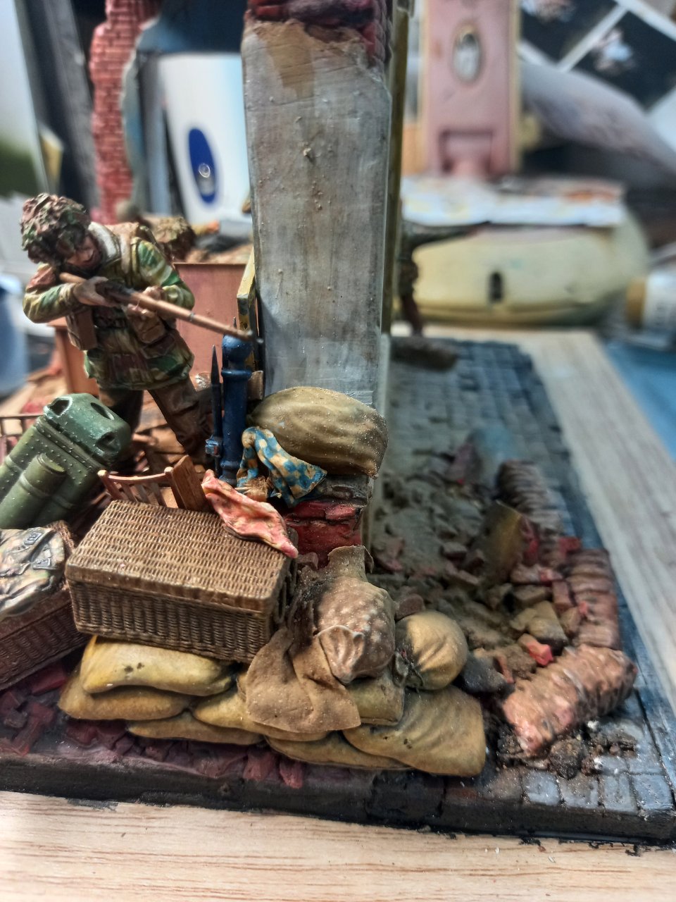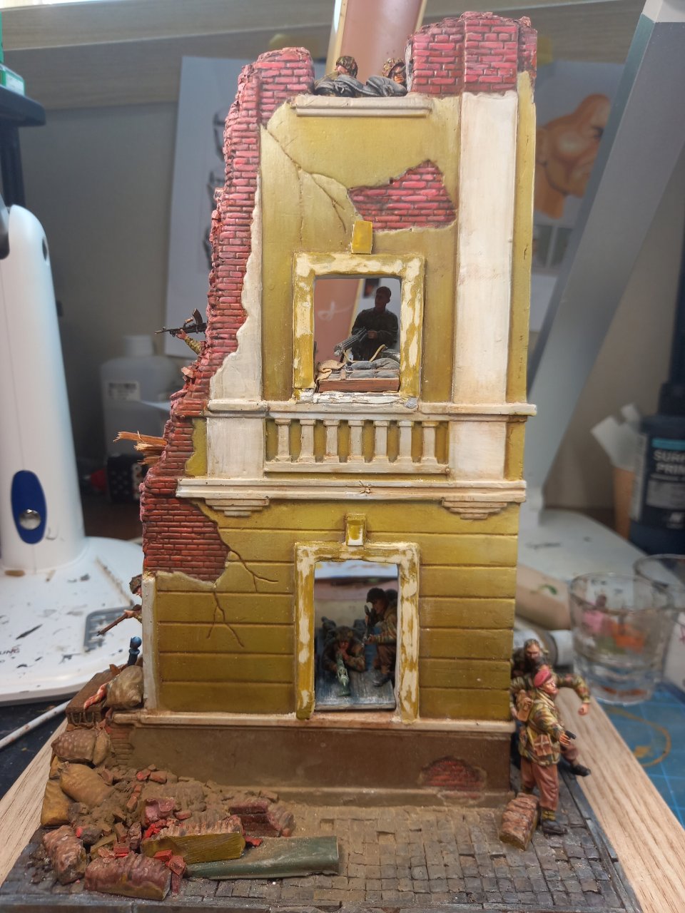 2층 정면에 창틀이 달았다가 떼어내고 빅커스 기관총을 놨습니다. 고증에는 어긋난다 합니다. 그냥 제가 좋아하는 영국군 기관총이고 마지막 방어 거점의 믿을수 있는 화기라는 이미지로(영화 와일드 기스의 마지막 장면의 이미지가 아직도 강렬해서요) 배치했습니다. 창틀 둘레? 는 흰색으로 칠했다가 석도로 부서진 흔적일 냈다가 어울리지 않아서 다시 갈아내서 색칠이 안되고 어정쩡한 상태입니다