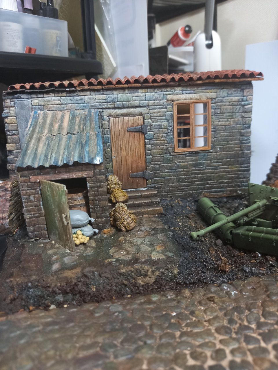 터진 감자 자루와 미니아트 수레 와 배낭 나무등걸등을 배치하고 대전차로 위치를 다시 잡았습니다.