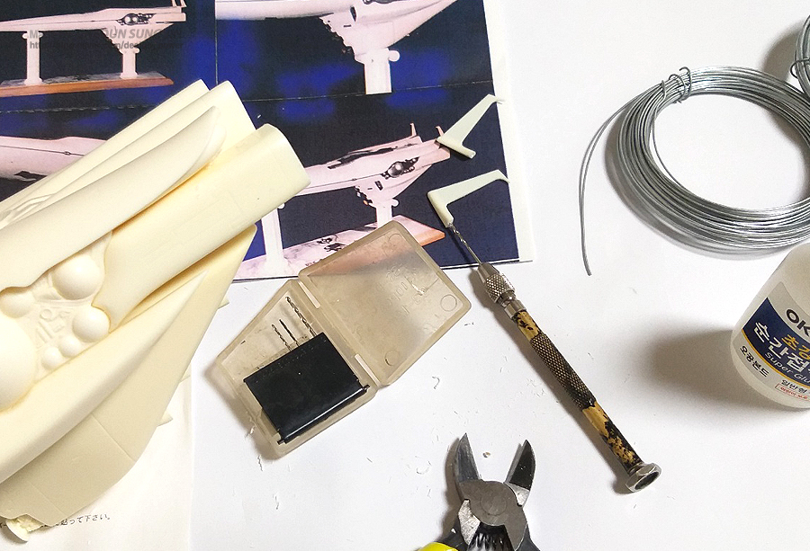 조립시 강도를 위해 일부 부품에 핀바이스 작업후 철사를