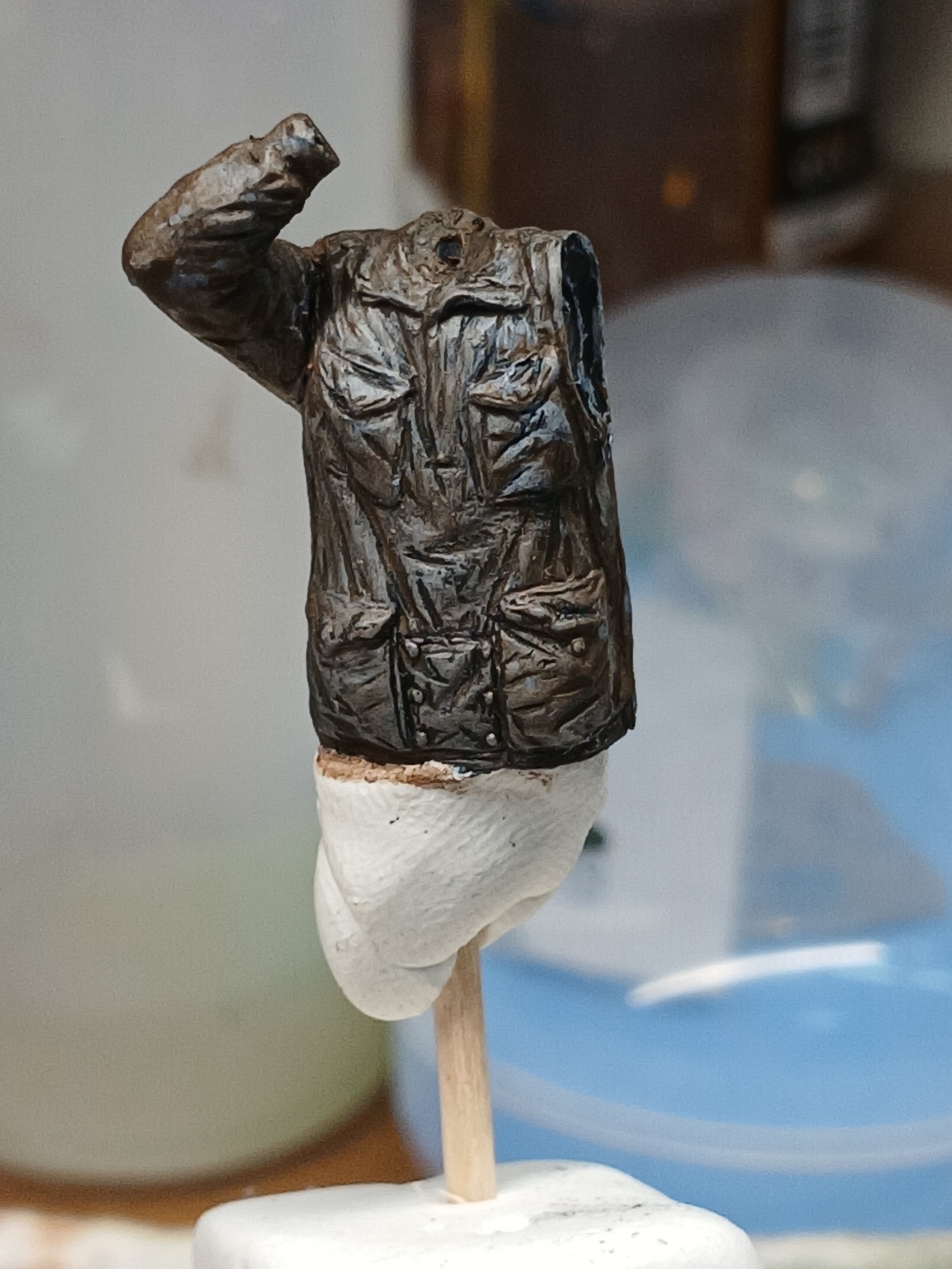 일단 경례 자세의 손과 얼굴위치가 맞는지 보기위해 기존에 칠해놨던 인형 얼굴을 끼우고 영국군식 경례손을 붙입니다 다크옐로우로 데니슨 스목 바탕색과 명암을 잡았습니다.