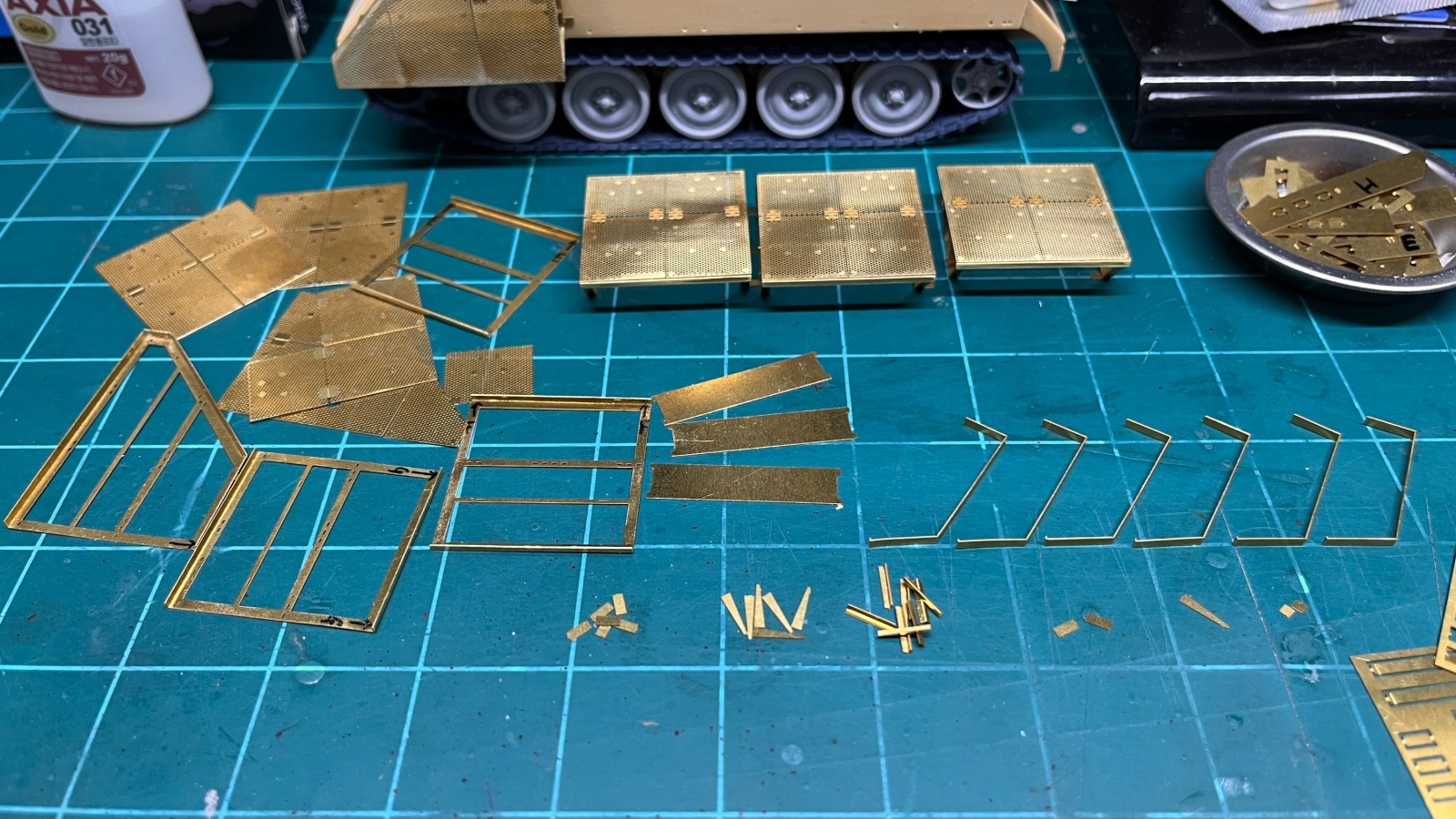 Legend Production의 제품은 3D 프로그램을 사용해서 설계한만큼 큰 믿음이 갔지만, 아마도 에칭판의 두께나 절곡에서 발생하는 공차까지는 계산이 덜 된 것도 같습니다. 조립을 하다보니 정확히 각도지정이 되어있지 않은 프레임의 하단부와 상단부의 길이가 미세하게 달라서 타공판이 붙어있는 프레임과 차체에 붙는 프레임들을 조립해보면 상단부에 약간의 여백이 있어서 단단하게 붙는 느낌은 아니었습니다. 측면에 각각 네개, 전면에 3개의 모듈을 붙여주는 구조이므로 나중에 모두 차체에 접착할때 균일하게 붙을 수 있도록 측면에 붙이는 프레임은 한쪽만 붙여놓고 이후에 차체에 붙일때는 가지런히 붙을 수 있도록 해두었습니다.