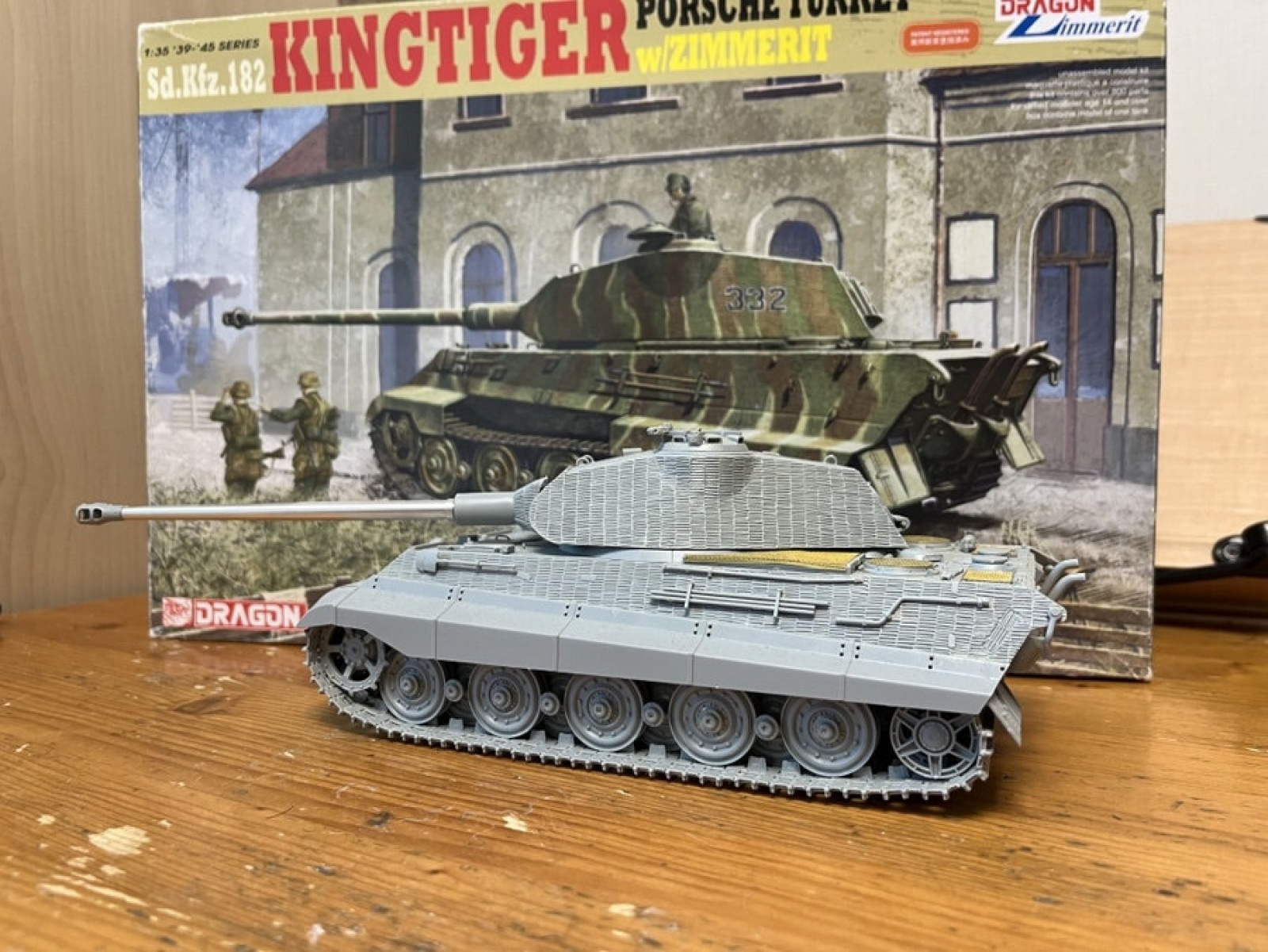 다음은 포르쉐 킹타이거 찌메리트입니다. 또 박스아트 구도대로 찍어보았습니다. 사이드 스커드가 몇개 손실된게 더 실전적인 것 같아서 평소에는 떼고작업하는데 이번껀 다 붙여 주었습니다.