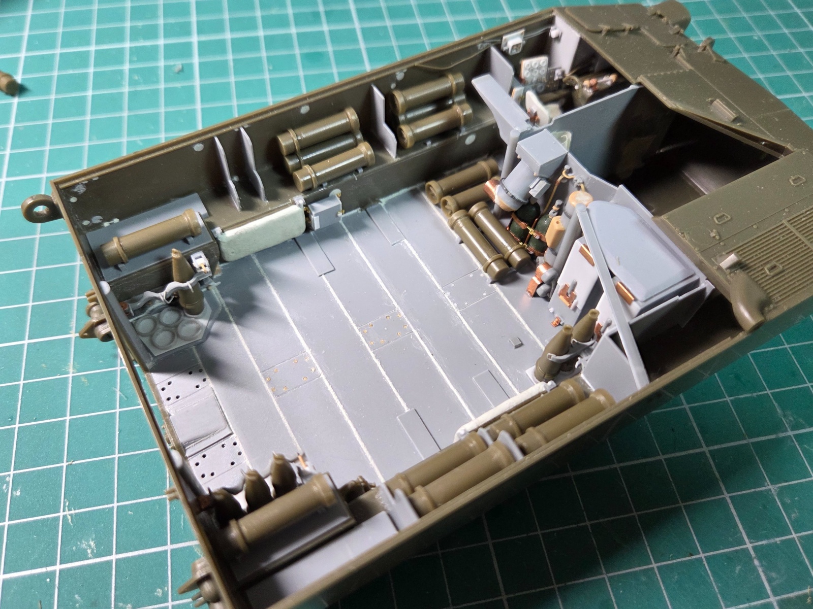 차체와 포탑 내부는 90% 정도 진척되었고, 조준경과 반자동 장전장치만 남겨둔 상태입니다. K55A1 특유의 반자동 장전장치에 관한 자료가 매우 부족하지만 최대한 비슷하게 만들기 위해 준비 중입니다.^^