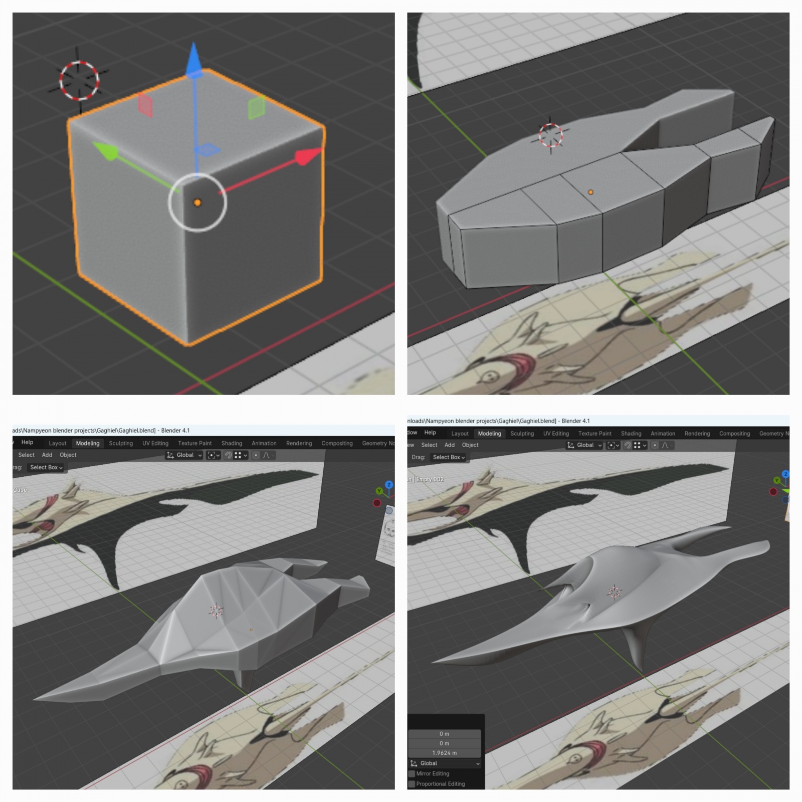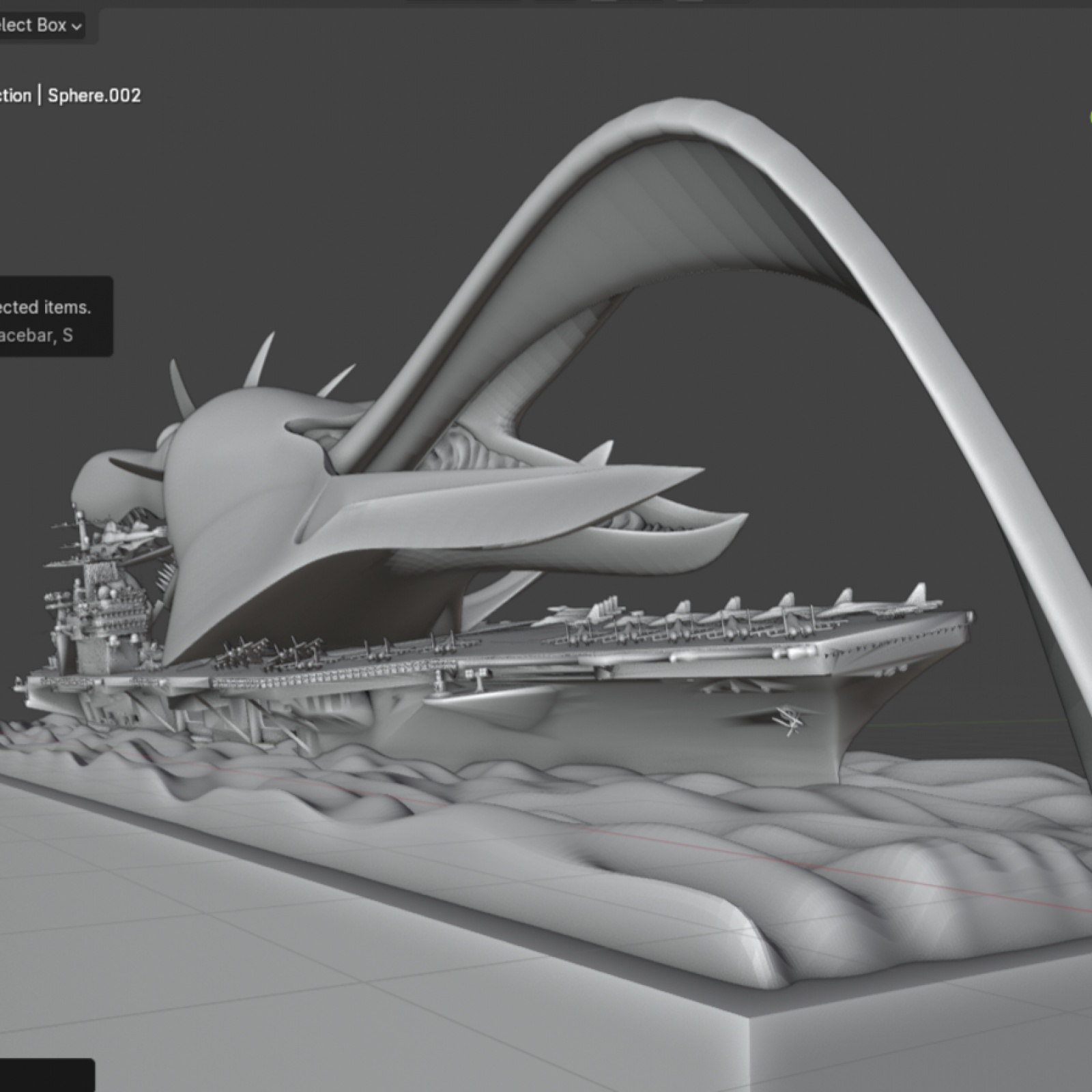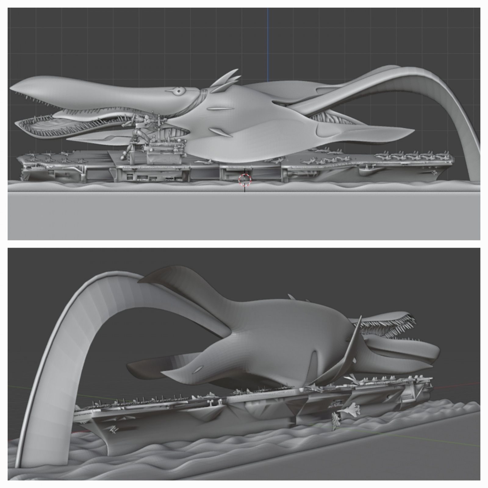 이제 구상중인 디오라마 최종편 입니다. 바다는 대충 만들긴 했으나 블렌더서 제작 가능합니다. 니미츠급 항모는 STL 파일입니다. 함재기는 SU33 에 가까운것 같은데 역시 파일을 다운받았습니다. 몇대는 바다로 빠지고 있고, 몇대는 폴리곤을 움직여 우그러지고 뒤틀린 모습으로...가기엘은 폴리곤을 이리저리 움직여 포즈를 바꾸어주었습니다. 애니에서는 항모 위에서는 입을 벌리지 않았던것 같으나 그래도 이빨을 보여주는게 더 괴수적인 느낌이 나서 놔두었습니다. SU33은 랜딩기어 추가, 에바 동력케이블도 추가하고 에바 STL 파일도 손을 좀 봐야 하겠지만 이 작업은 여기서 끝내려 합니다. 다음작품으로 찾아뵙겠습니다.
