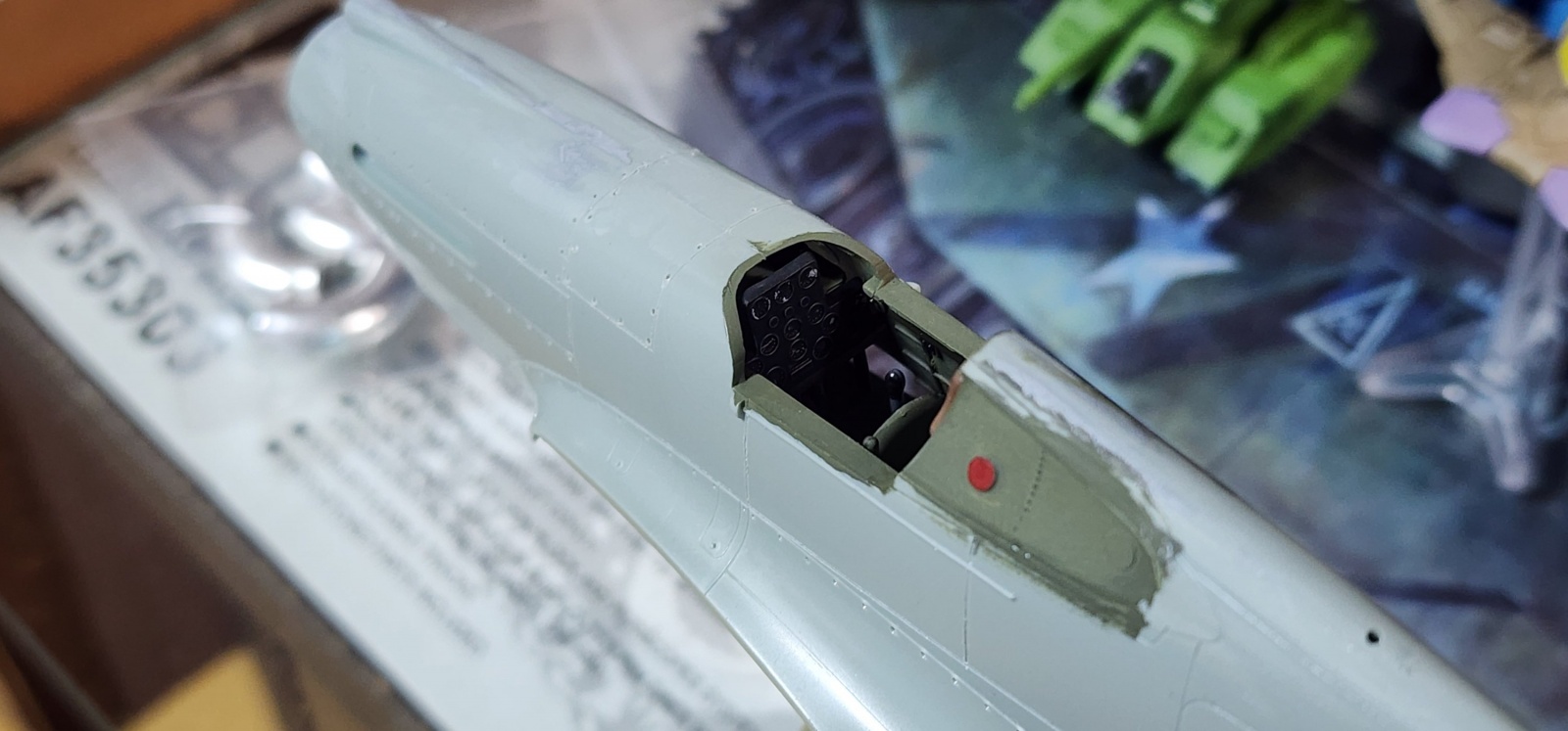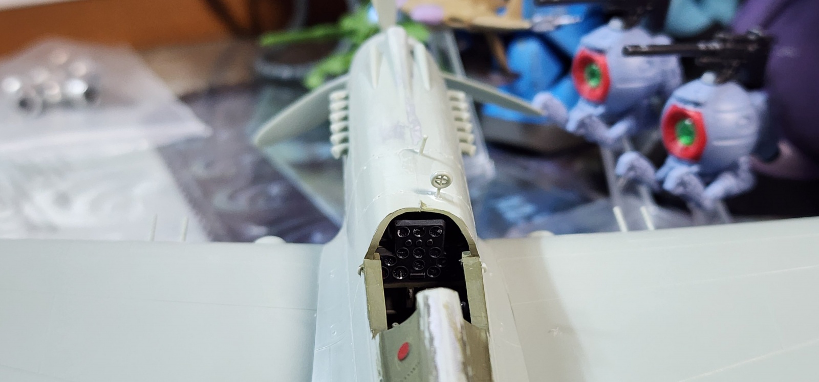 이 상태에서 이제 퍼티를 발라주고 다시 다듬어준 상태입니다. 엔진 카울링 상부 에어 인테이크가 뭉뜩하게 미성형되서 퍼티로 다시 만들어주고 이미 조립하기 전에 동체 좌우 부품의 리벳을 송곳으로 다 찍어준 상태이지요.