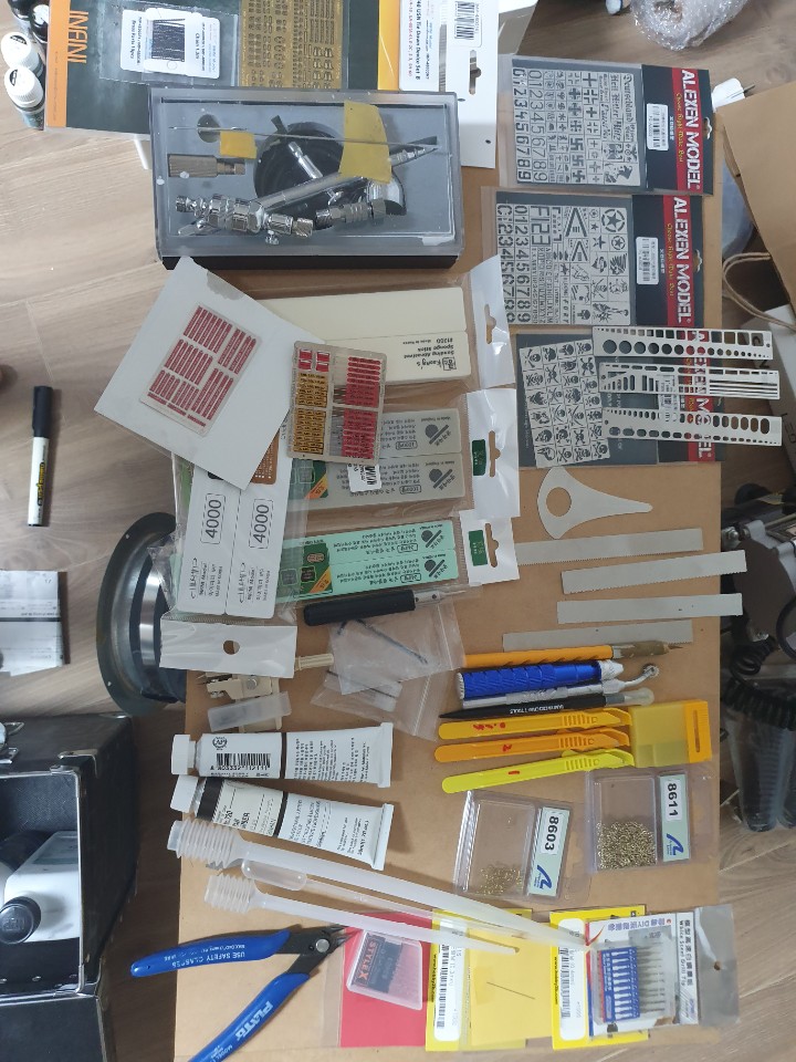 스포이드3개 , 유화물감 미개봉 (로우엄버,번트엄버) , 절단컴퍼스 +여분날 , 사포미개봉(240 1000 1200 4000) , 사슬 , 고리 , 페널라이너 (0.15 , 0.1 , 0.2) , 타미야 페널라이너 0.2 , 아트나이프 + 여분날 , 니퍼 , 핀바이스 , 애칭톱 , 리벳롤러 , o짜 모양으로 리벳찍는공구 + 여분날 , 리벳템플릿자 , 템플릿3개 , 미개봉스텐실템플릿3개