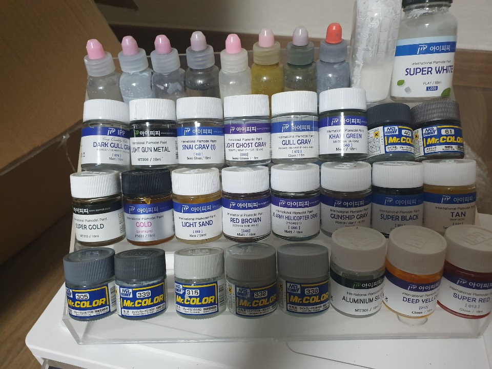 70% 정도 남은 ipp락카 : 다크걸그레이,라이트건메탈,수퍼골드,골드,라이트샌드,레드브라운,미군헬리콥터그레이,건쉽그레이,슈퍼블랙,탄
