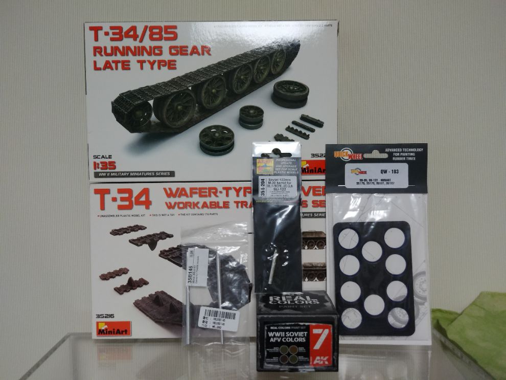 Miniart SU-122용 Quick wheel, AK interactive WW2 Soviet AFV color, Miniart 1/35 T-34/85 running gear, T-34 workable track wafer type입니다.