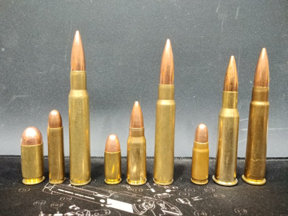 좌로부터..45acp, 30카빈, 30-06 스프링필드, 9mm 루거, 7.92mm kruz, 7.92mm mauser, 7.62mm 토카레프, 7.62×54r, 303 british....
