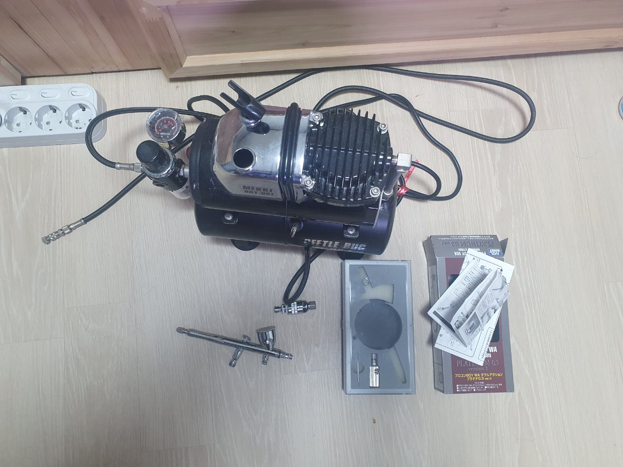 전 주인분께 구매 후 사용할 시간이 없어 창고에 있다가 정리하면서 판매하게 습니다. 에어브러쉬 구성품은 호스빼고 전부 다 있습니다. 비틀벅 호스가 있어서 작동엔 문제 없습니다. 오늘 신너로 청소하면서 잠깐 작동해봤는데 잘 작동되네요. 직거래 선호합니다만 5천원 선불로 택배거래도 가능합니다. 지역은 경기도 화성시 봉담이구요. 010-3757-5823 입니다.