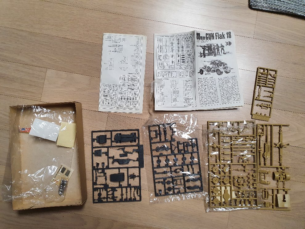 - 3.뽀빠이과학 1/72는 차량,사이드카의 부품일부 런너에서 분리및 인형 분실 일부조립(사진2참조)되었으며 88mm포 부품이 같이 들어있고 이역시 일부부품(손잡이 인형 등)없고, 로보트 1대 들어있습니다.(사진3)