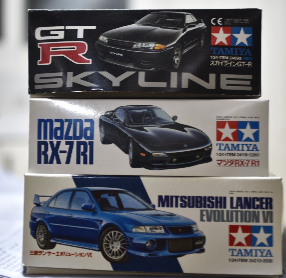 3. 타미야 1/24 랜서에볼루션, 닛산 스카이라인,마쯔다RX7--이니셜D출연차들로 구성했습니다, 이중 란에보만 박스 우그러짐, 내용물 미개봉, 데칼상태A-3개합 55,000원 (송료포함)