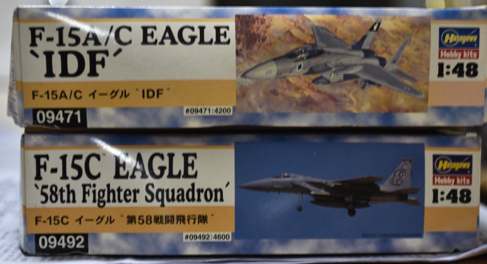 1. 하세가와 1/48 F-15C 58TH FS, F-15A/C IDF--2키트 모두 박스상태 안좋으나 내용물 미개봉이며 데칼상태A, 특 징: 2키트 공히 GE엔진에칭, 조종석 인테리어, HUD, 백미러에칭이 포함되어 있는 제품--2개합 묶음판매 총6만원(송료포함)