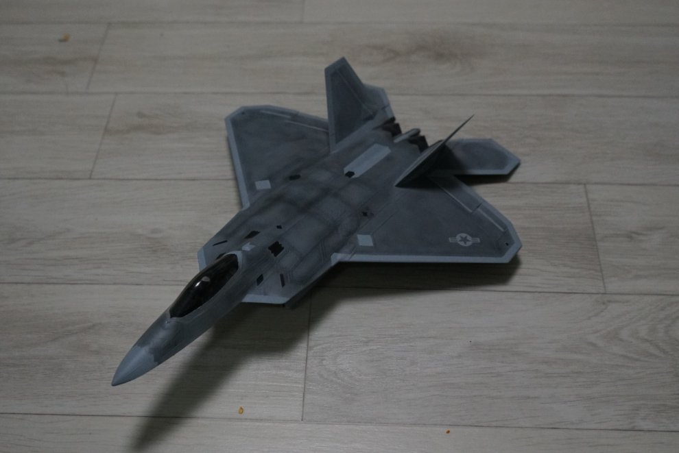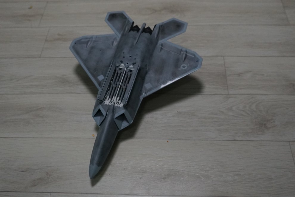 도색은 일반 단색이 아닌 실버 위에 수많은 색들을 도장하여 실제 스텔스 도색의 느낌을 그대로 재현 했습니다. 무장창은 주 무장창만 열고 AIM120 암람 미사일 6발 탑재 했습니다. 랜딩기어는 올라간 상태로 제작 하였고 구매할 시에는 파인하비 항공기용 거치대 중 을 증정 해 드립니다