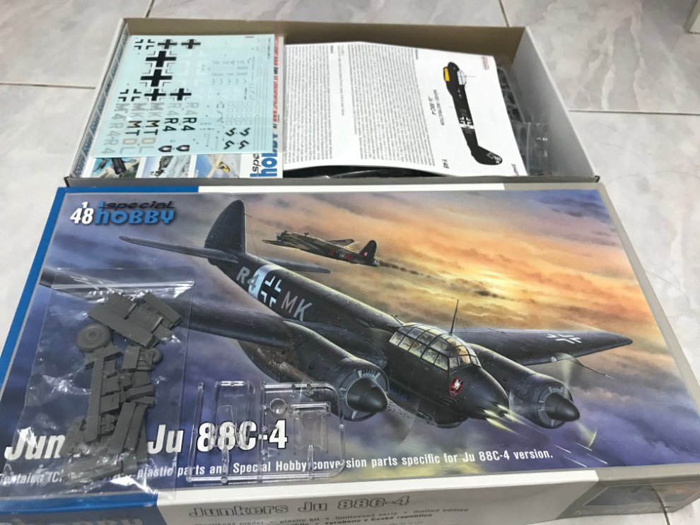 스페셜하비 1/48 ju88 c4 : icm ju88 a-5키트에 카르토데칼 및 레진 휠 등 + 스페셜하비 제작 투명파트 및 콕핏내부 기총마운트 및 기총 일반파트 등으로 구성 되어있습니다.