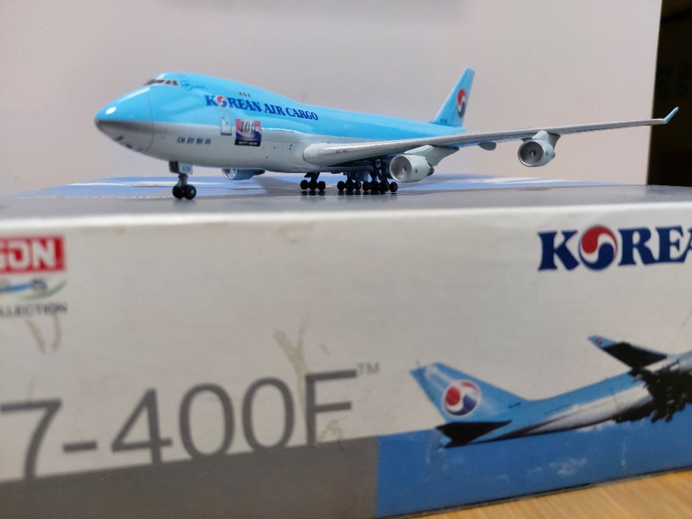 22. 1/400 Dragon wings 대한항공 카고 B747-400F HL7601 ₩4,000 (박스 손상 있음, 스탠드 사용 불가(스탠드 끼우는 구멍이 막힘, 지상상태로 주기 시 문제 없음), 미익 끝부분 및 윙팁 도색 일부 벗겨짐, 단독구매 불가)