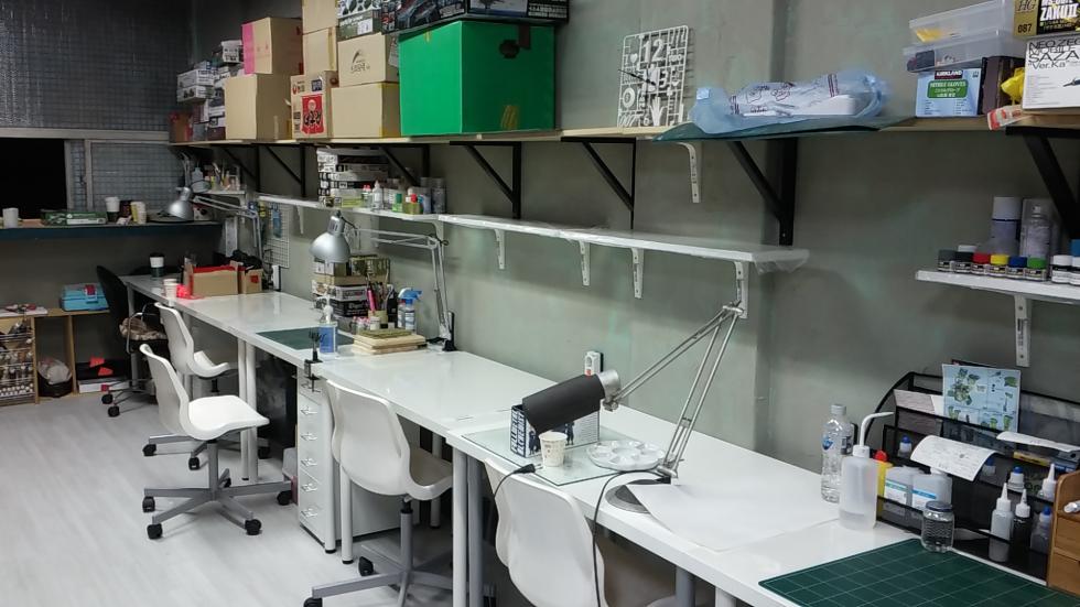회원시 혜택 : 개인 작업테이블(100×60)과 20~30개의 킷보관이 가능한 선반, 개인 사물함