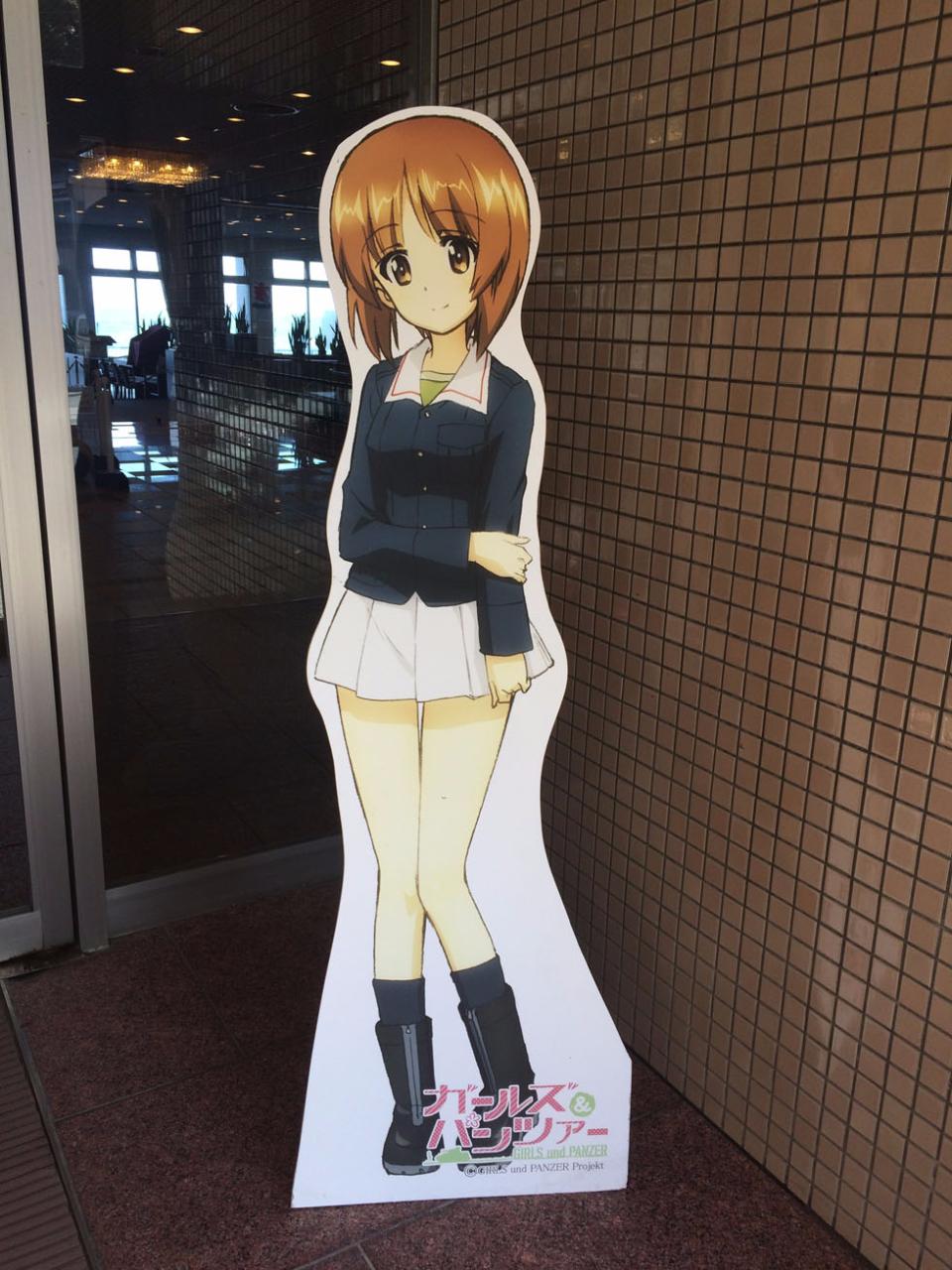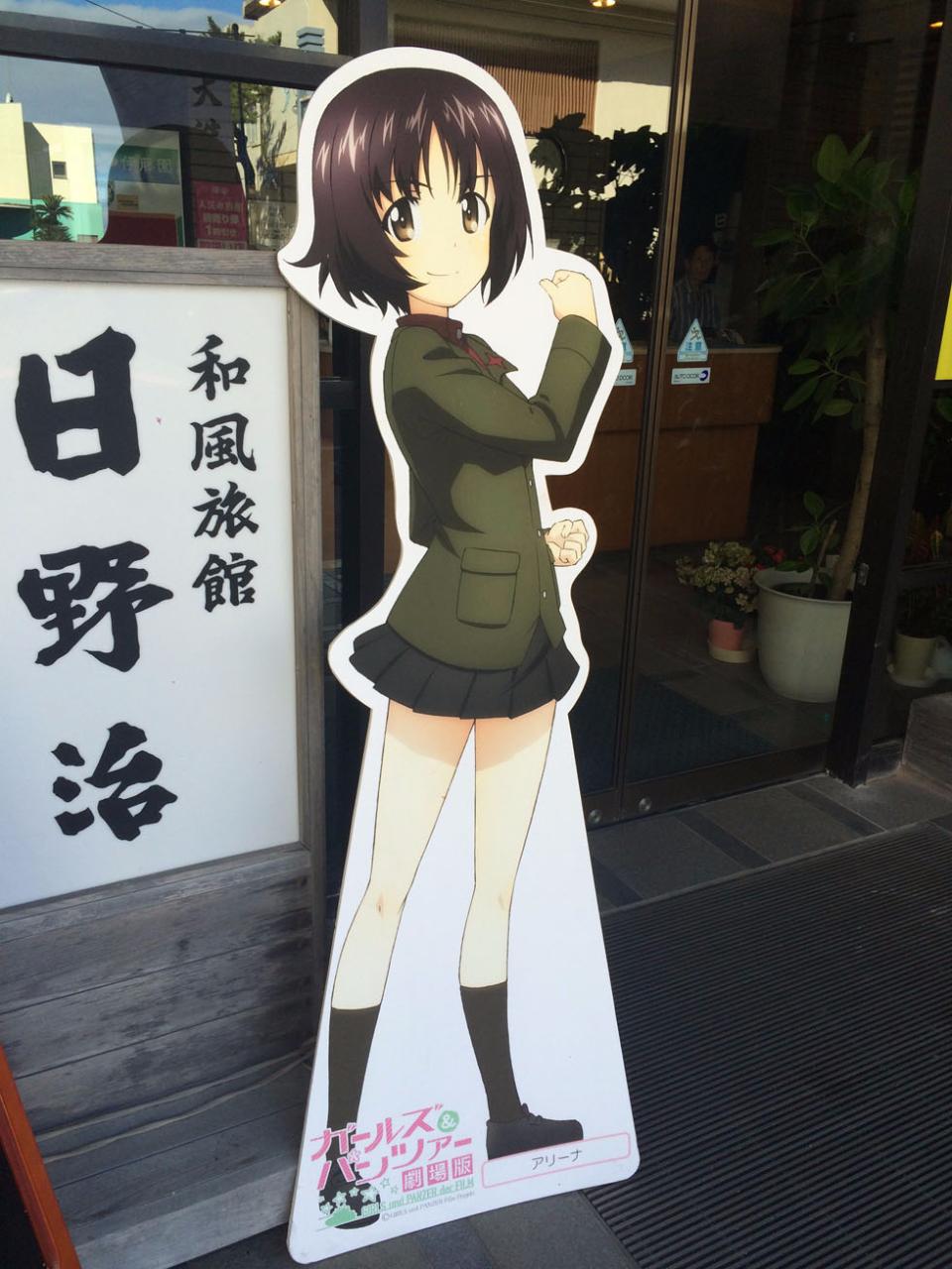 여관 앞에 서있는 프라우다 고교팀 KB-2 전차 승무원 아리나의 캐릭터 입간판.