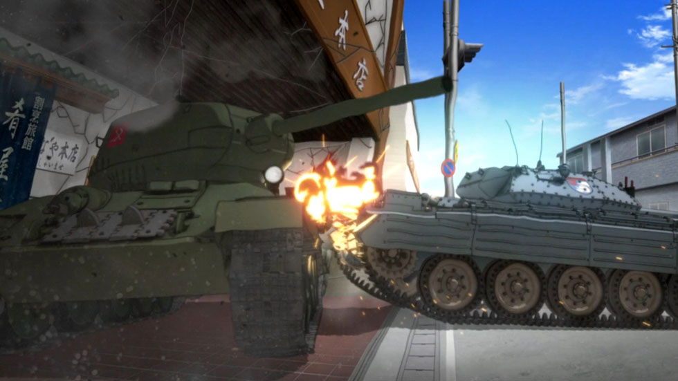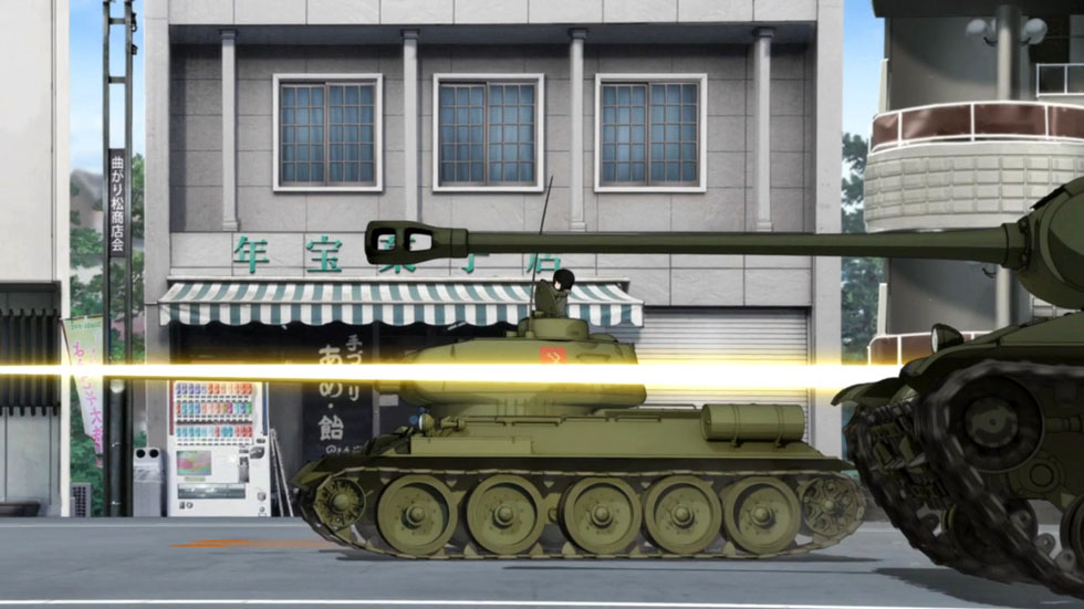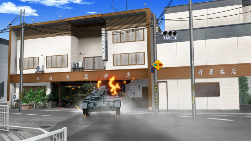 TV판에서 세인트 글로리아나 학원과의 친선전에서 가게가 박살난 이래 극장판에선 T-34/85와 크루세이더의 충돌로 붕괴되어 더욱 유명해진 바로 그곳!