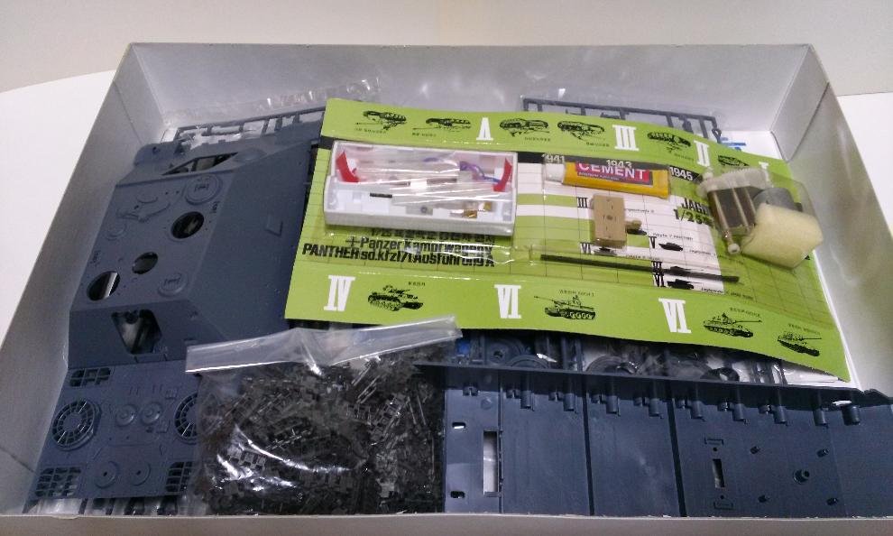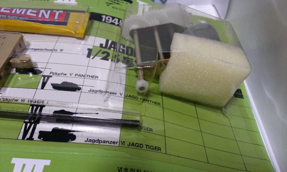 아카데미 판터를 RC로 만들기 위한 전차의 모든 부품이 봉지에 다 들어있는듯 합니다. 향후 조종기(및 포함된 서보)를 구입하면 알씨로 굴릴 수 있겠네요.