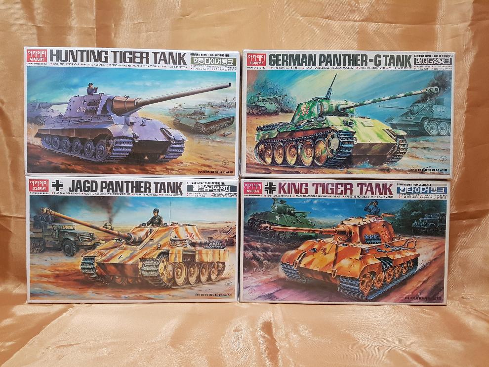 위 이미지는 아카데미 1/48 카세트 모터박스 4종을 모아놓은 것입니다. 요즘은 생산이 되지 않는 것 같구요, 80~90년대 주로 판매된 제품으로 보여집니다. 이 제품도 초판그림이 있는 것으로 아는데, 제 소장품은 그 후에 그림을 새로 그린 재판 제품인 것 같습니다. 가급적 초판 박스그림을 소개하면 그 연배에 맞는 분까지 즐거움을 드릴 수 있을텐데, 그 부분은 아쉽지만 다음 기회로 미루었음 합니다. 다만, 재판이지만 국내 작가분께서 그린 박스그림이며, 90년대 주류적인 스타일을 보여주는 바, 그것만의 감상의 즐거움이 있을 것으로 생각합니다.